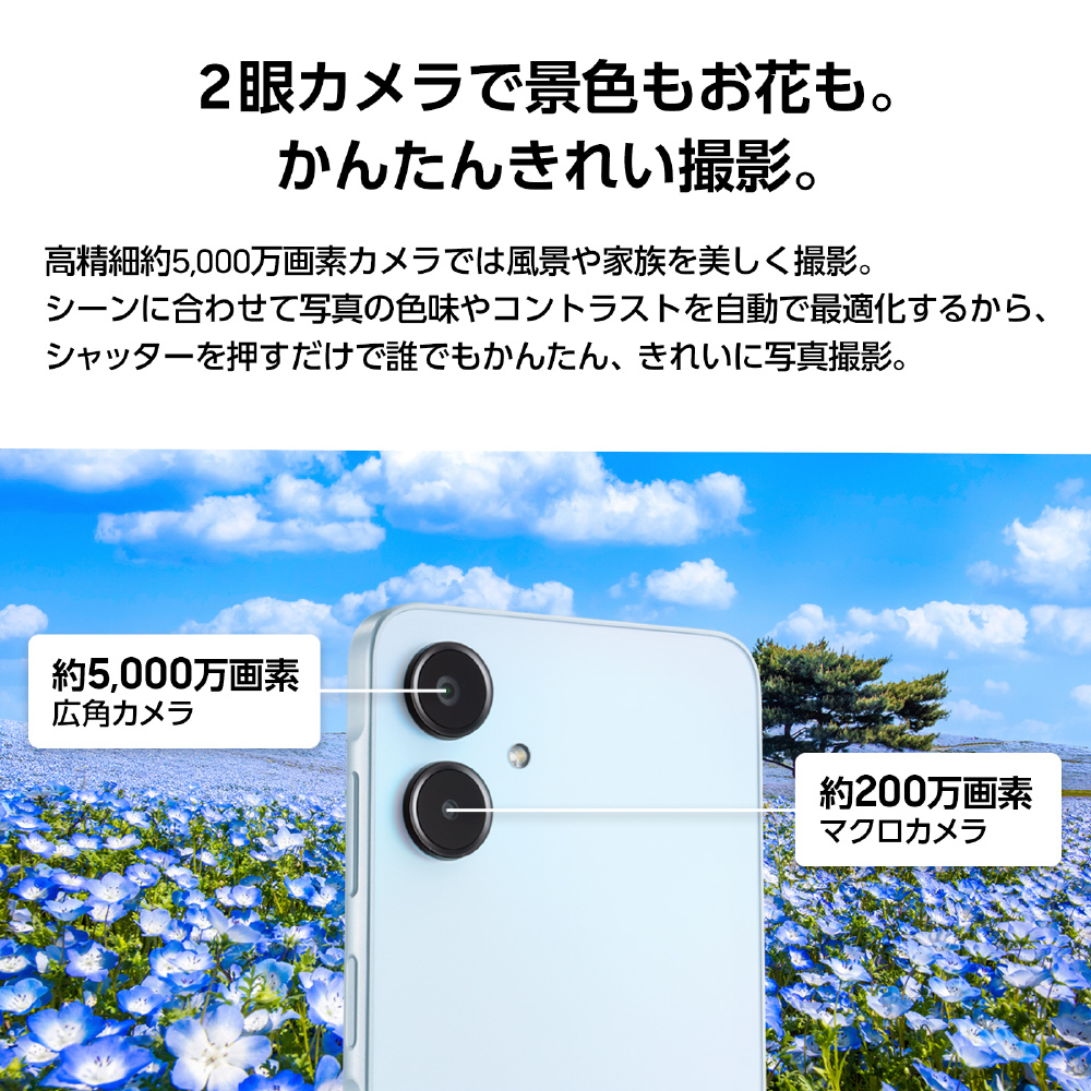 大きな文字とシンプルな画面表示で、スマホを初めて使う方でも使いこなせる「かんたんモード*1 」や、スマホの使い方を無料で相談出来る「Galaxy使い方相談」直通電話*2を搭載。