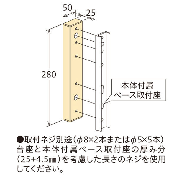 壁からの出寸法の調整に使用するアルミ台座です。笠木が大きく出っ張っている場合や物干の左右が平行にならない場合、このパーツで出寸法を調整します。