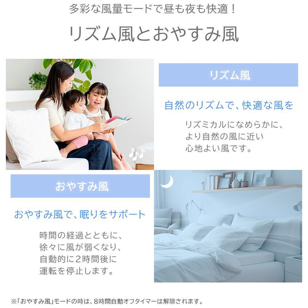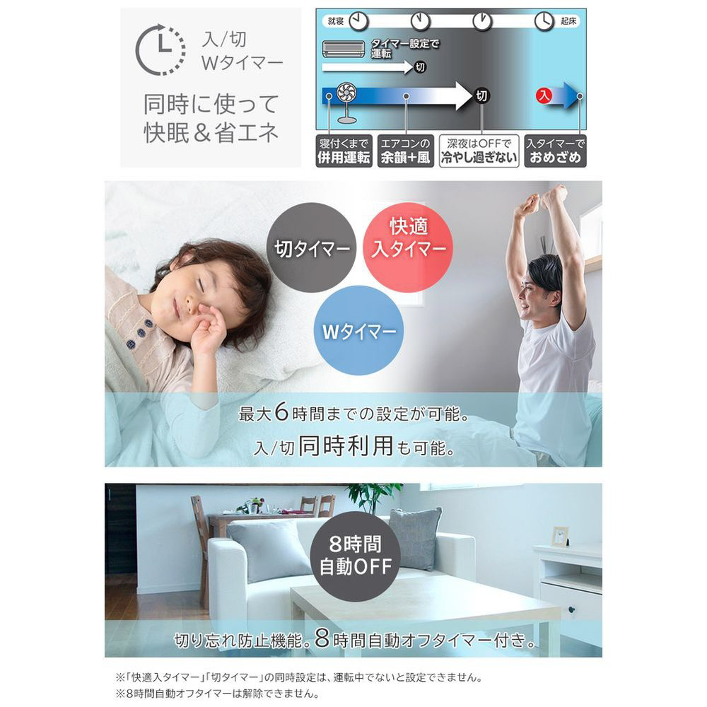 約90°上向き(手動)、リズム風、微風、風量8段階、快適入りタイマー、切りタイマー、入切タイマー同時設定、8時間自動切タイマー、ダイヤル式風量調節、風量MAXボタン、消音機能、リモコン付き