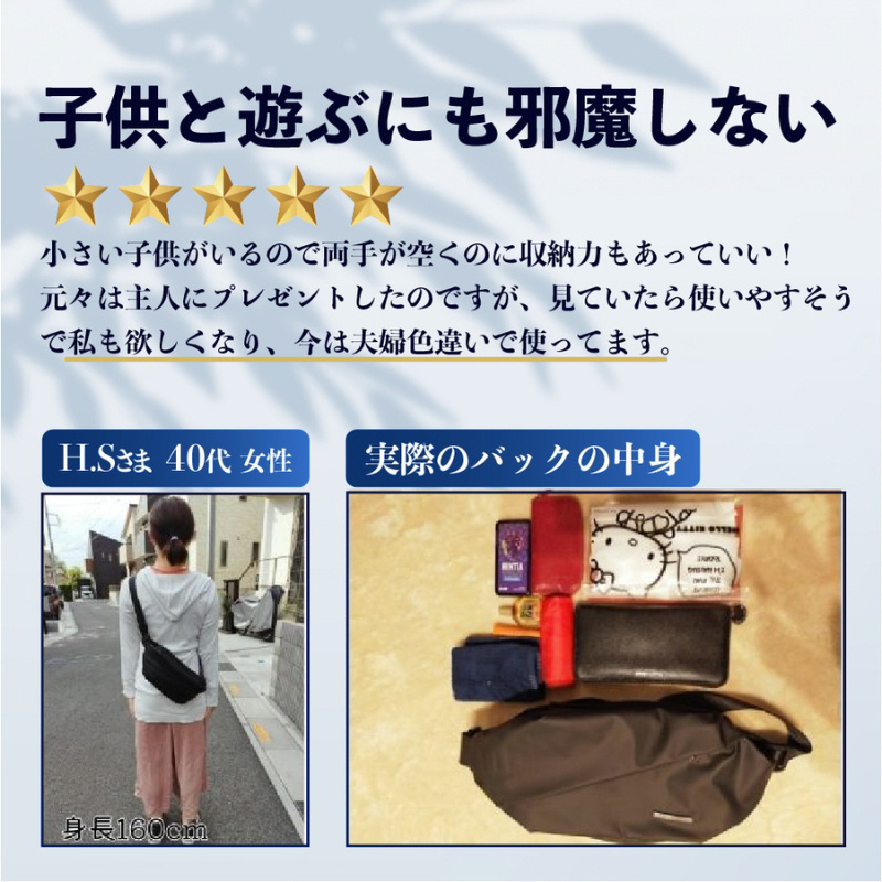 中身がグチャグチャで取り出しにくい、荷物が入りきらない、そんな荷物の悩みを解決し、週末が楽しく快適になる、ちょっとしたお出かけにちょうどいいボディバッグです。