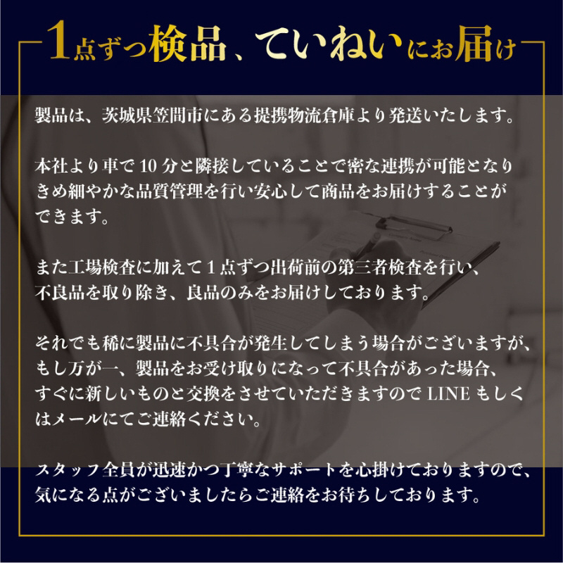 長くご愛用いただくために、通常使用での破損、不具合があったらすぐに修理・交換いたします。返送費用もいただきません。