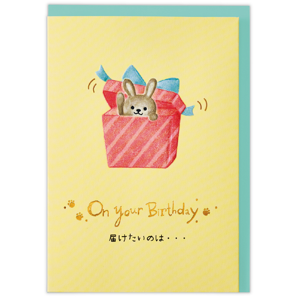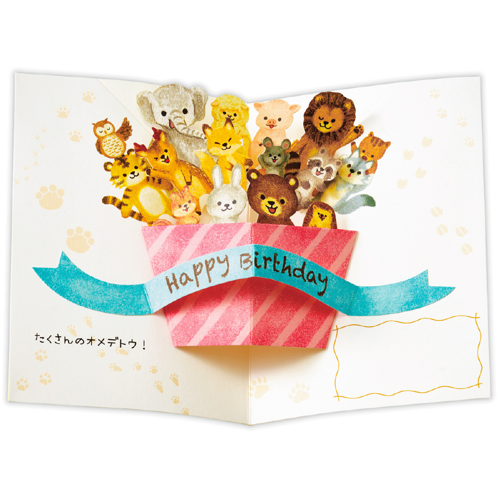 シンプルな表紙を開くと、プレゼントボックスに入った動物たちがワッとポップアップする楽しいバースデーカード。キュートな動物たちがたくさん描かれています。