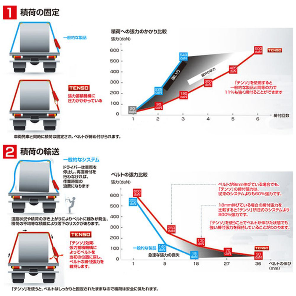 締付張力を維持することで、荷物の安全を確保します。