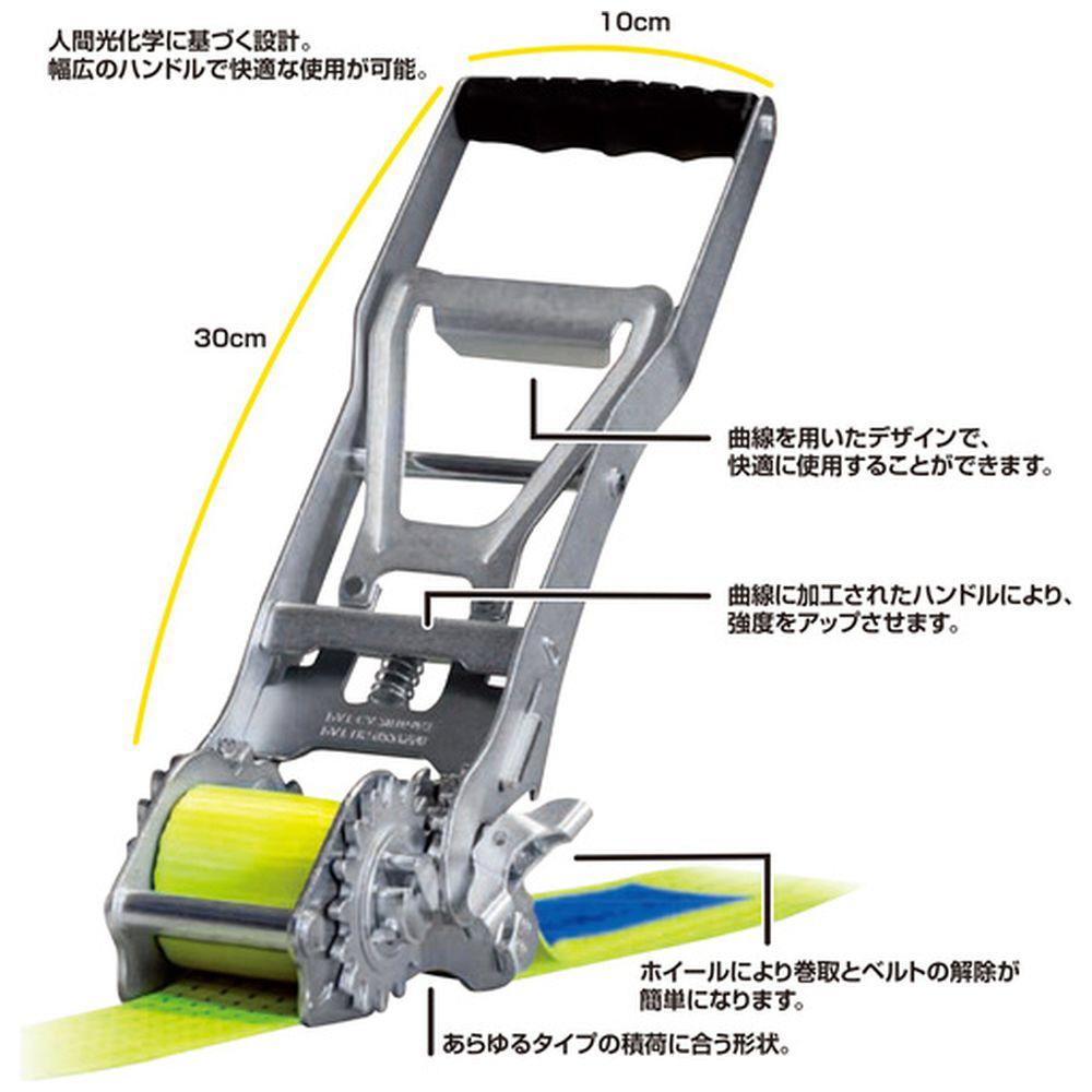 3つのギアホイールによるパワフルな締付けと素早い作業が可能なベルト荷締機です。