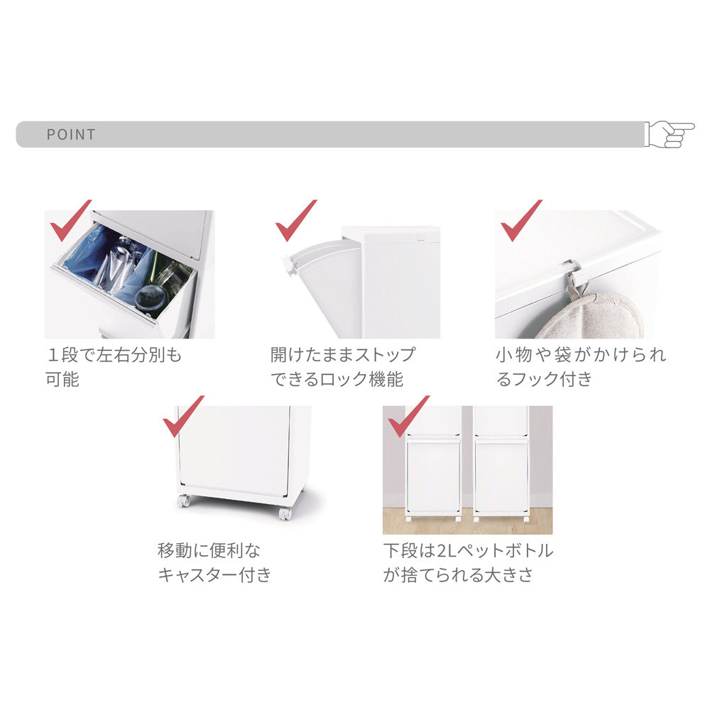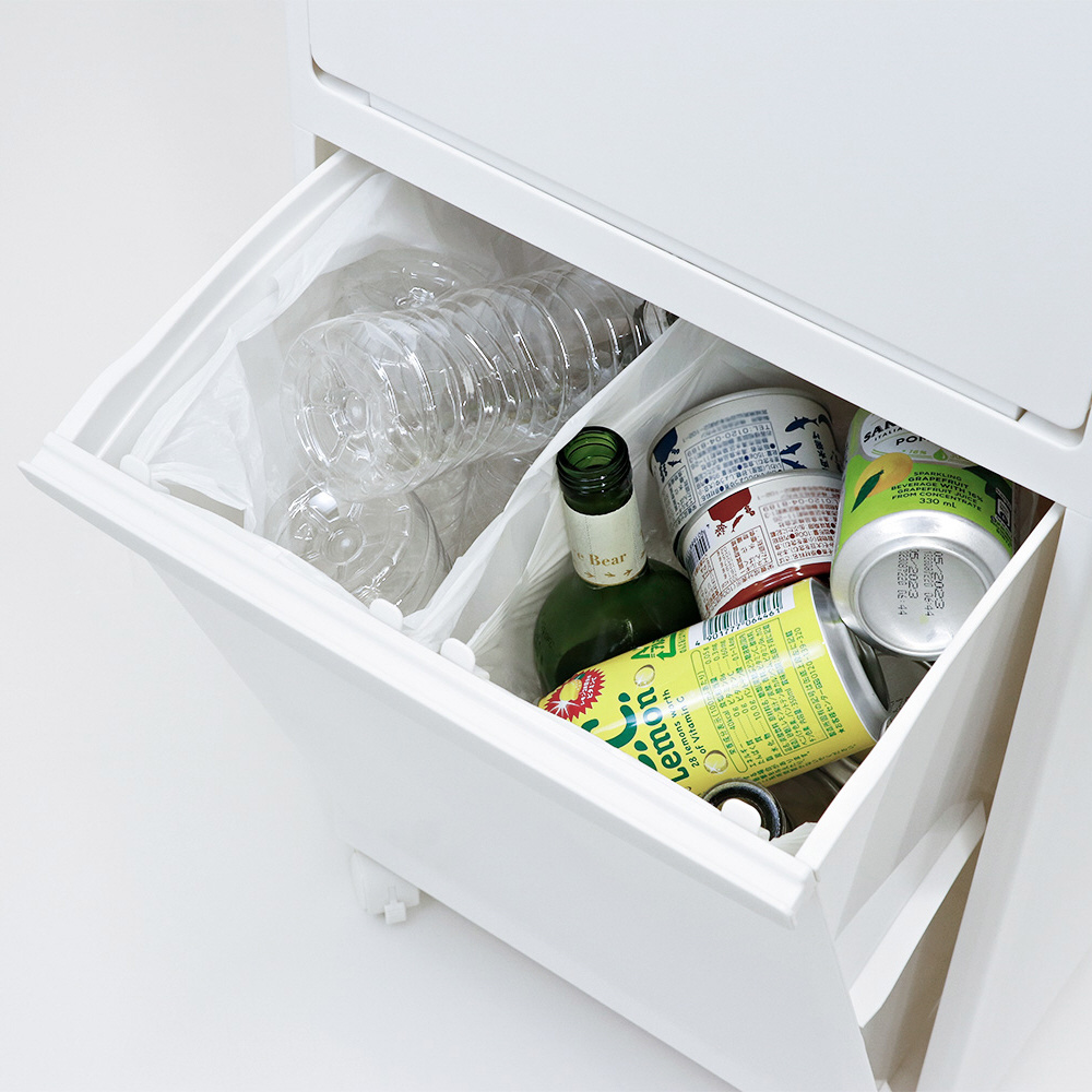 1つの引き出しにつき2分別できるので効率よく使えます。引き出しは取り外して丸洗いできるので清潔に使えます。