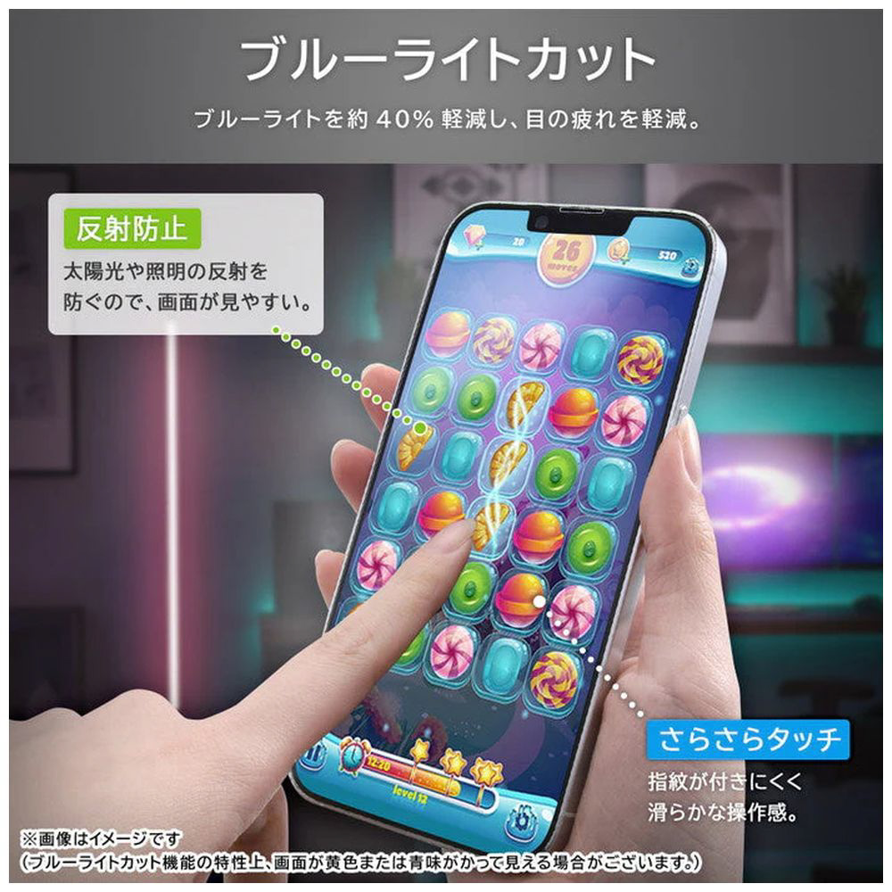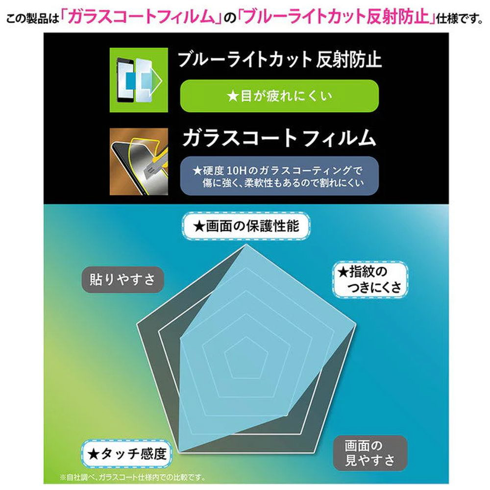 目の疲れを軽減/反射防止。ガラスコーティングを施し、ガラスフィルムと同等の硬度10Hと、貼り直しの際に割れる心配のないPETフィルムの柔軟さを両立。