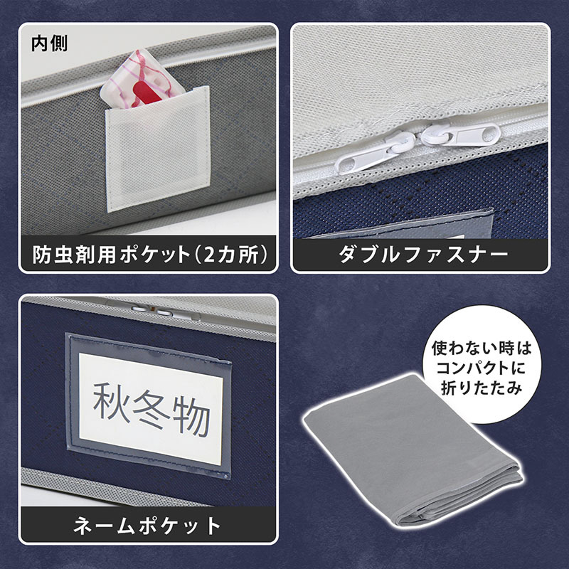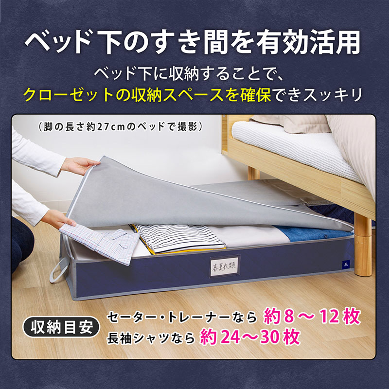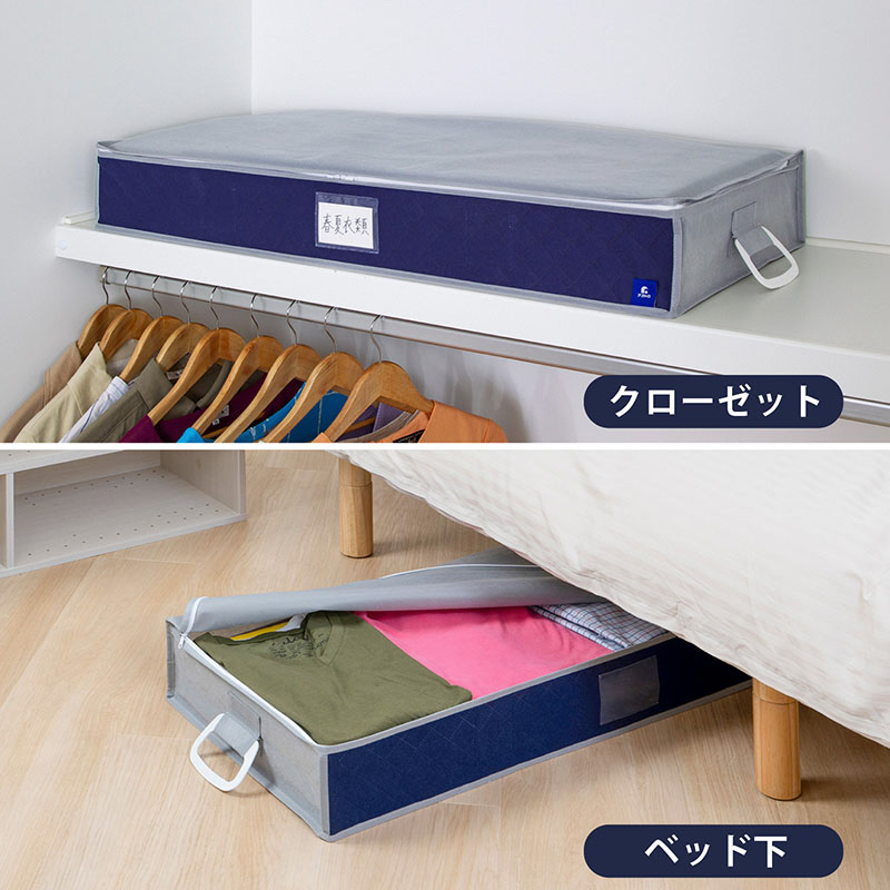 両サイドに持ち手付きでベッド下からの出し入れや持ち運びもラクラク。クローゼットの上部の棚や押し入れの隙間などにも。