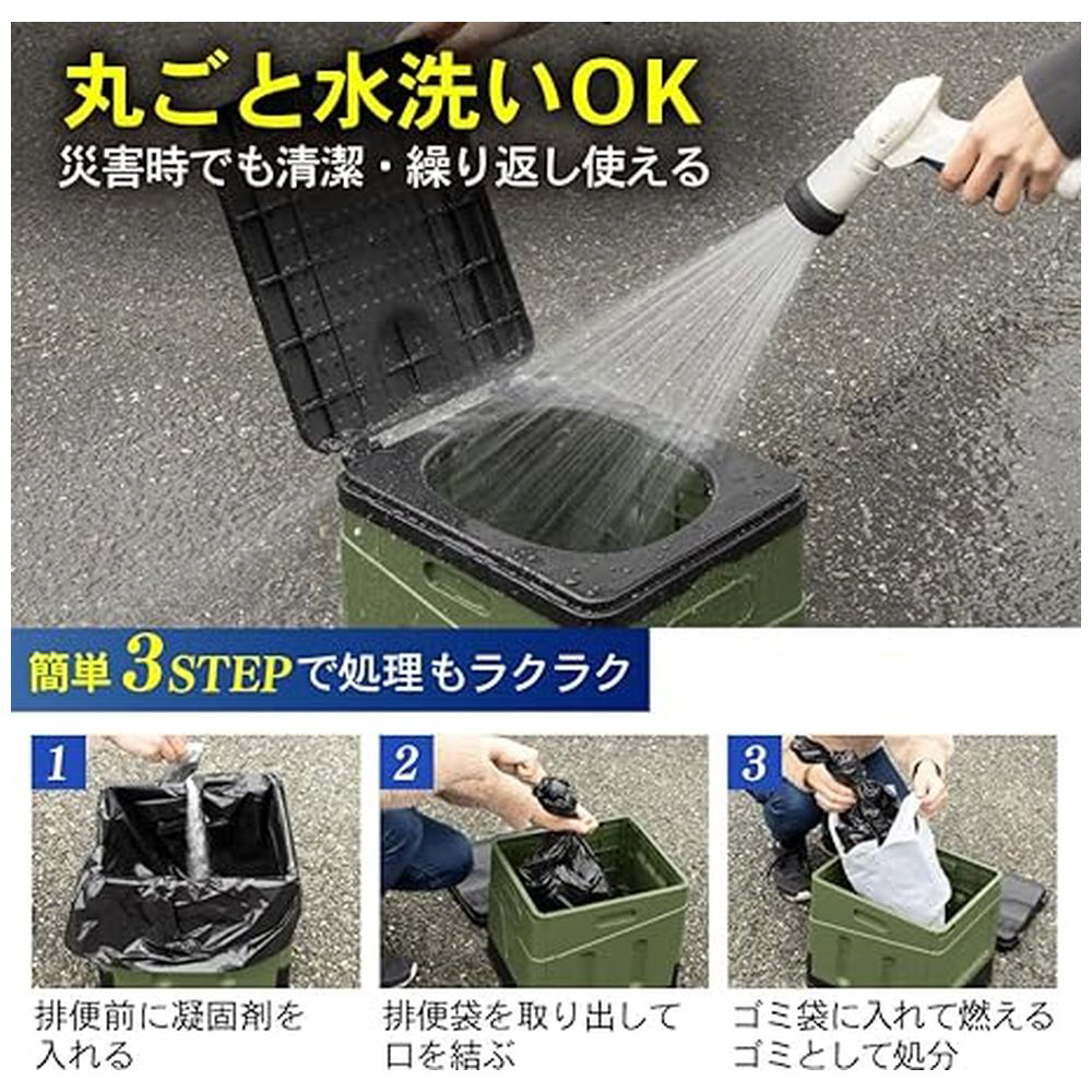 本体はプラスチック製で丸ごと水洗いができ、非常時でも清潔な状態を保つことができます。汚れを心配する必要がなく、災害時でもストレスフリーでトイレを使用することができます。