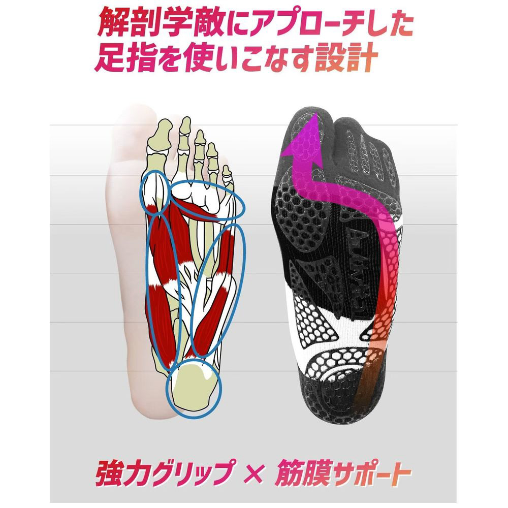 特許取得の編み組織が可能にする足首の安定感、足指を強く使える5本指形状が生む質の高いサポート性。