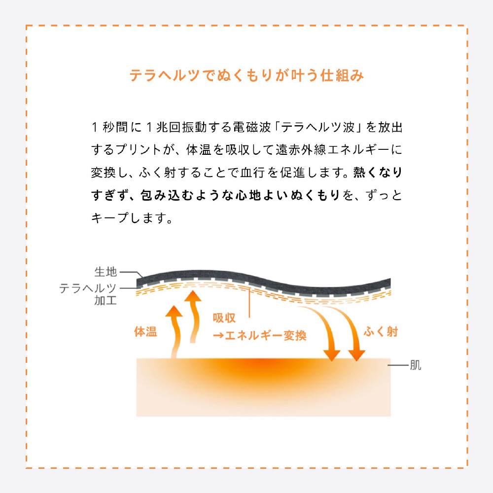 1秒間に1兆回振動する電磁波「テラヘルツ波」を放出するプリントが、体温を吸収して遠赤外線エネルギーに変換し、ふく射することで血行を促進します。熱くなりすぎず、包み込むような心地よいぬくもりを、ずっとキープします。