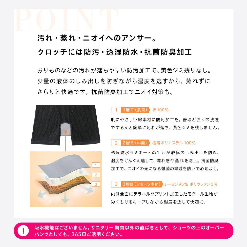 おりものなどの汚れが落ちやすい防汚加工で、黄色ジミ残りなし。 少量の液体のしみ出しを防ぎながら湿度を逃すから、蒸れずにさらりと快適です。抗菌防臭加工でニオイ対策も。