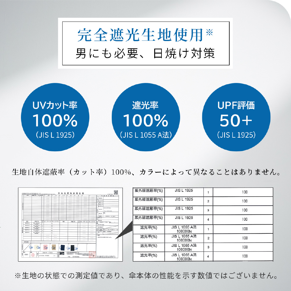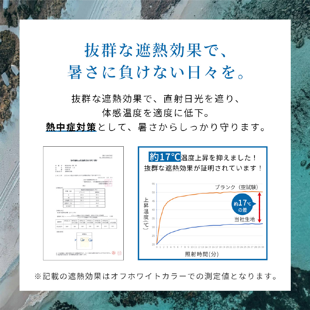 日本繊維製品品質技術センターにおいて、遮光率100%、UVカット率は100%、遮熱効果、撥水5級の最高ランクと証明された生地を採用。