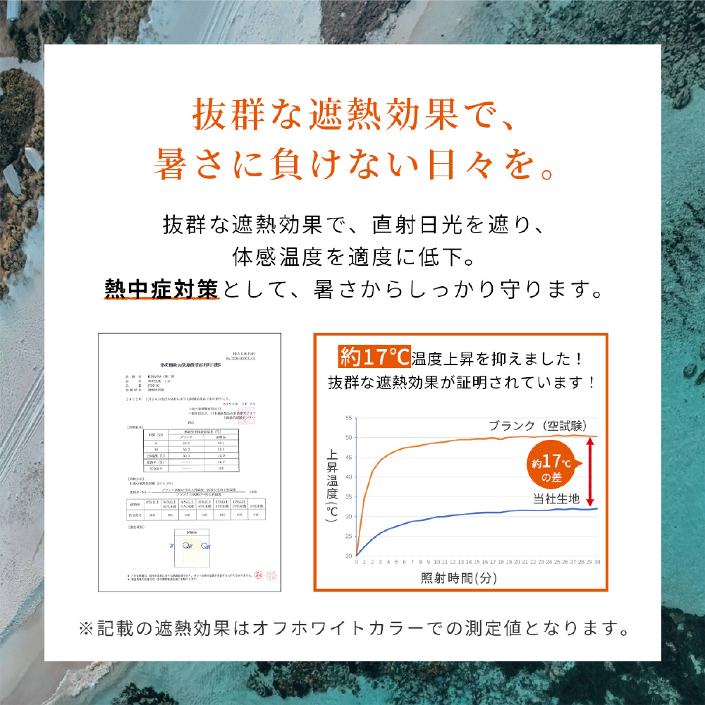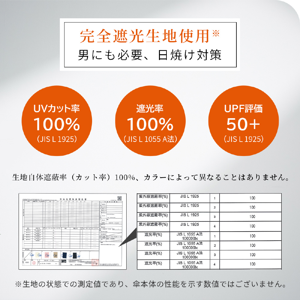 日本繊維製品品質技術センターにおいて、遮光率100%、UVカット率は100%、遮熱効果、撥水5級の最高ランクと証明された生地を採用。