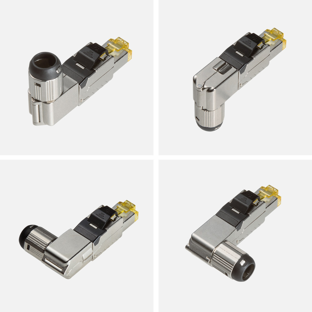 自作用CAT6A規格対応、LANコネクタ。L字型。シールド付き。かしめ工具不要、再利用も可能。