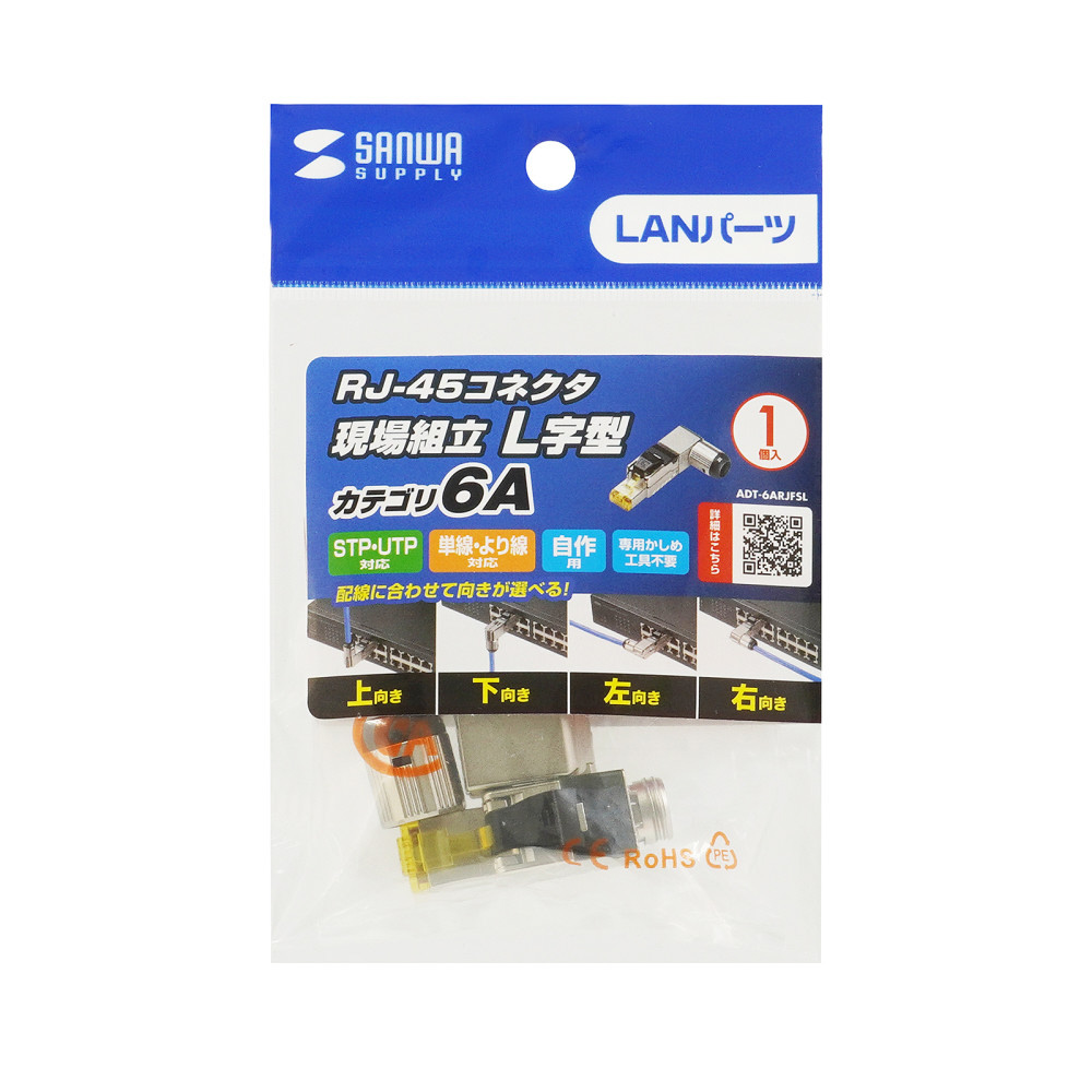自作用RJ-45コネクタ(L字型・カテゴリ6A・かしめ工具不要) ADT-6ARJFSL