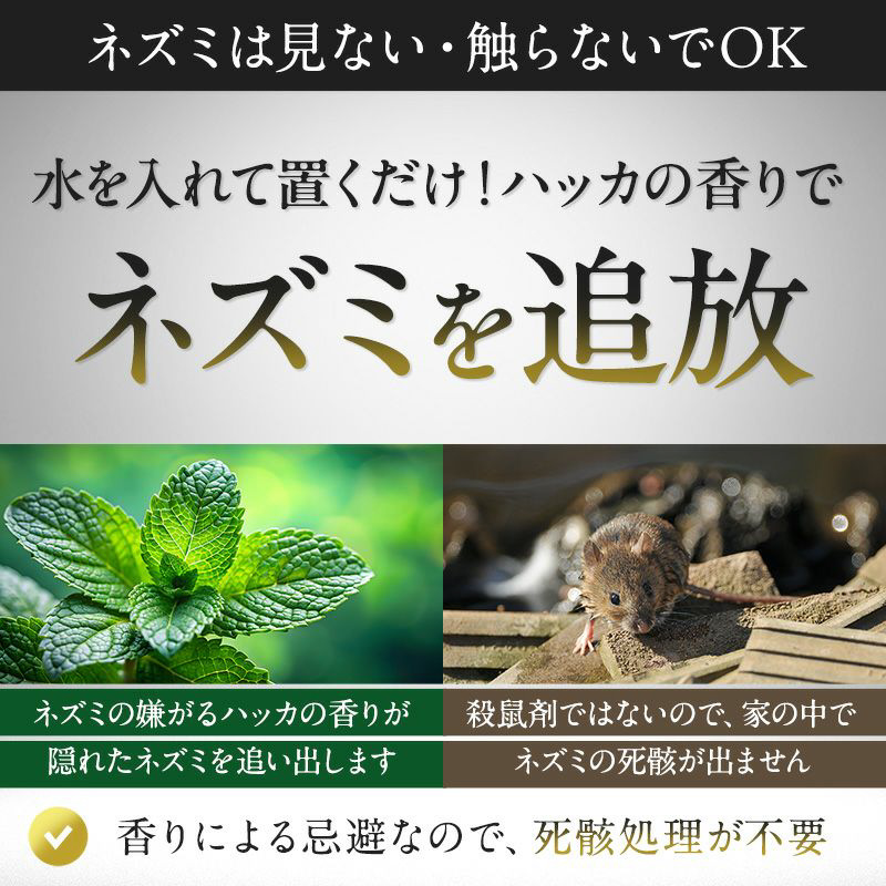 ・ネズミのいやがるハッカの香りで隠れたネズミを追い出す!(駆除剤ではないので、死がいが出ることはありません)