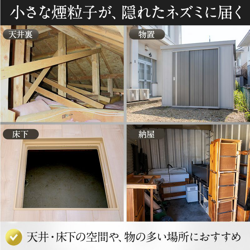 天井裏や床下に住みつきやすい「ネズミ」・「不快害虫」を同時に対策できる燻煙剤です。