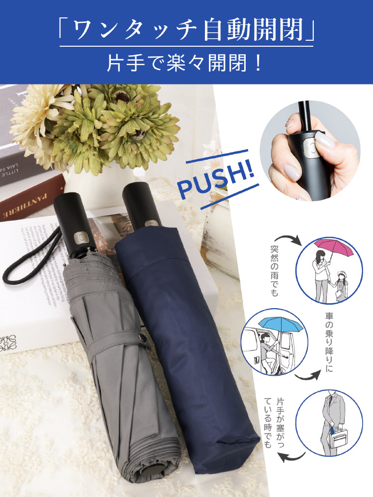 ワンタッチ自動開閉なので、片手が荷物で塞がっている時や車の乗り降り時など、軽く開閉ボタンを押すだけで開閉できますのでとても便利です。