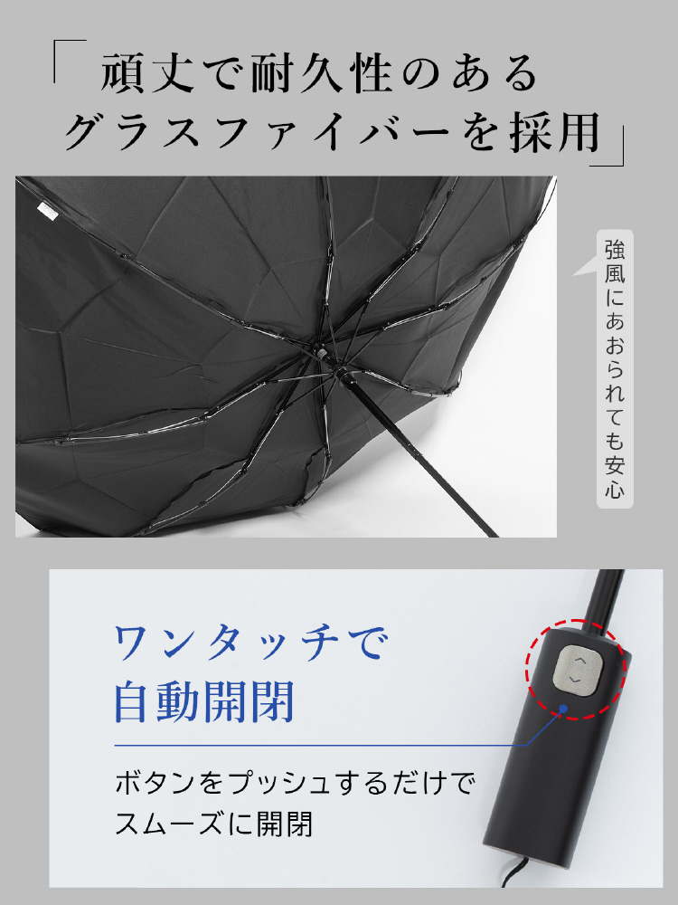 自動開閉機能に不意な飛び出しを防ぐ逆戻り防止機能搭載で、一般的な自動開閉折りたたみ傘より安全に閉じられます。