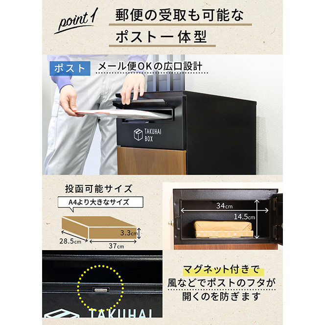 【郵便の受け取りも可能なポスト一体型】上部は広口のポストになっていてA4サイズより大きな回覧板、メール便なども受け取り可能!ポストのフタはマグネット付きで風などで開きにくくしています。