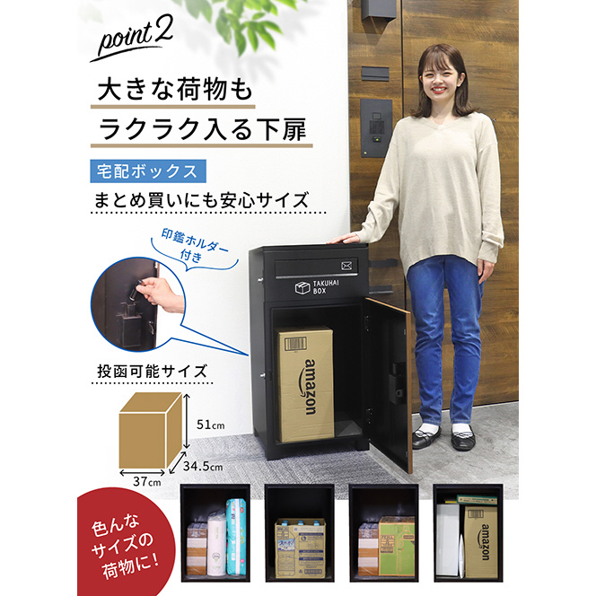 【大きな荷物もラクラク入る下扉】下扉は大きめの荷物を受け取れるスペースを確保!まとめ買いにも安心サイズ!扉の内側に印鑑ホルダーを用意。
