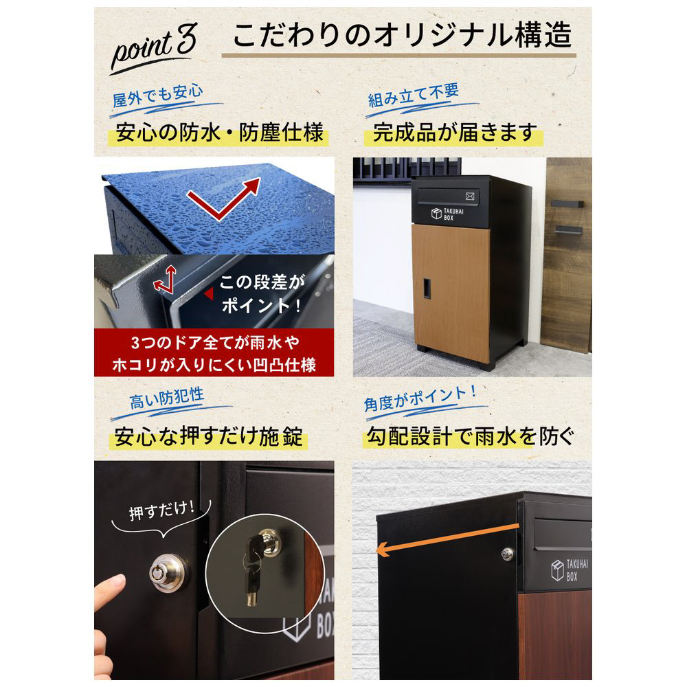 防水・防塵構造:ポスト内側、扉内側には雨水やホコリの侵入を防ぐ段差のある構造を採用!シンリンダ―プッシュ錠:防犯性の高いシリンダー錠を採用、しかも押すだけの簡単施錠!上下扉の鍵は共通になっていて1つの鍵で上扉も下扉も開錠できて便利!高さ調整用ネジ:脚には高さ調整のアジャスター完備!設置場所に合わせて傾きを調整することができます。組み立て不要の完成品:届いてすぐに設置完了、使い始めることができます。