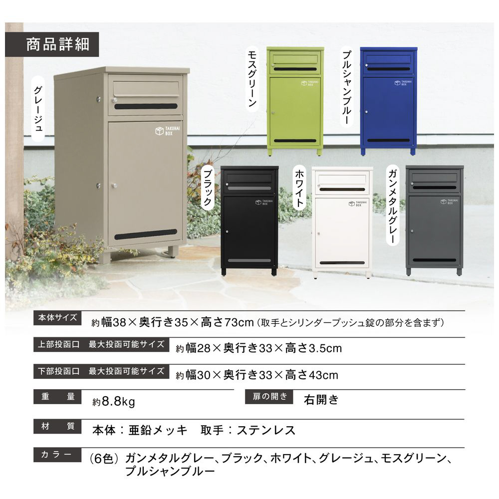 【こだわりのオリジナル構造】勾配のある天板:天板は勾配があり雨水をためにくい構造。防水・防塵構造:ポスト内側、扉内側には雨水やホコリの侵入を防ぐ段差のある構造を採用!シンリンダ―プッシュ錠:防犯性の高いシリンダー錠を採用、しかも押すだけの簡単施錠!上下扉の鍵は共通になっていて1つの鍵で上扉も下扉も開錠できて便利!高さ調整用ネジ:脚には高さ調整のアジャスター完備!設置場所に合わせて傾きを調整することができます。組み立て不要の完成品:届いてすぐに設置完了、使い始めることができます。