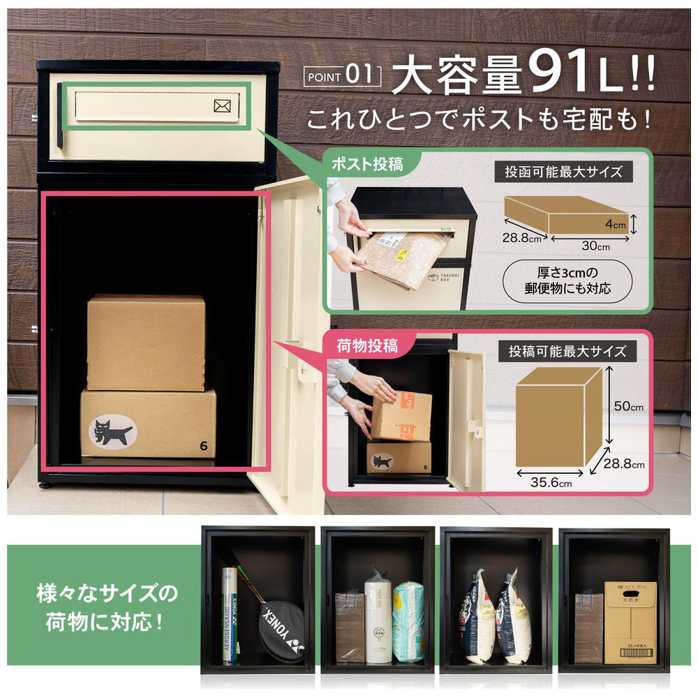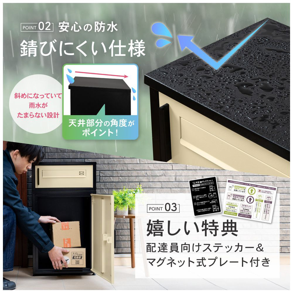 従来モデルには少ない、「投函口が2つ」付属されてるため、下からは大きくて重い荷物もしっかり受け取り、スペースに余裕があれば上から何回も投函可能です!