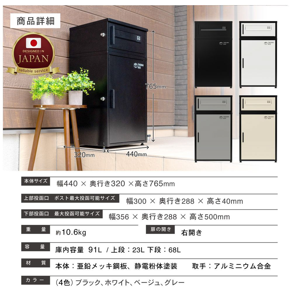 本製品 TAKUHAI BOXは、今までの常識を覆し、デザイン性と機能性を兼ね備えた最新モデルの宅配ボックスです。
