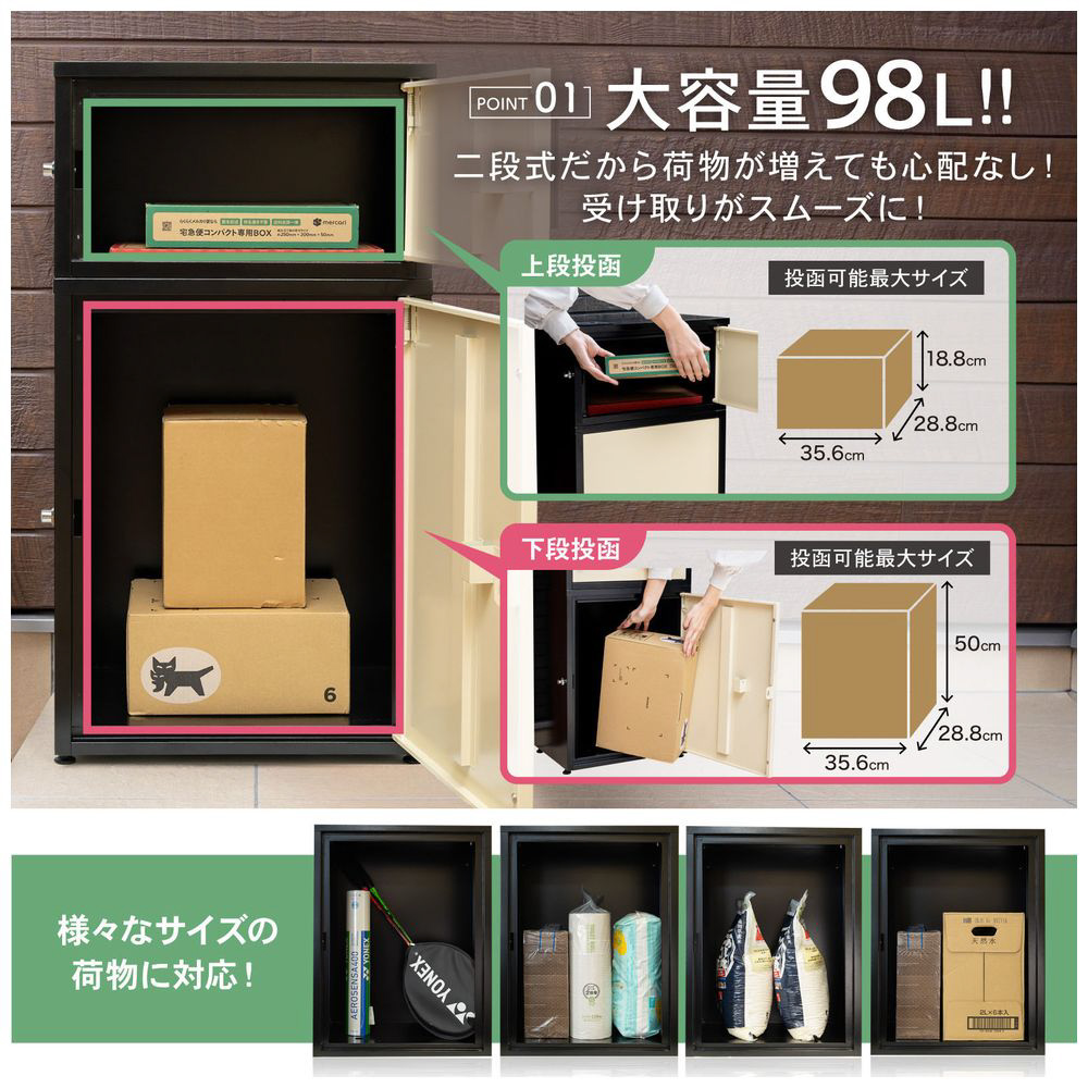 従来モデルには少ない、「投函口が2つ」付属されてるため、下からは大きくて重い荷物もしっかり受け取り、スペースに余裕があれば上から何回も投函可能です!