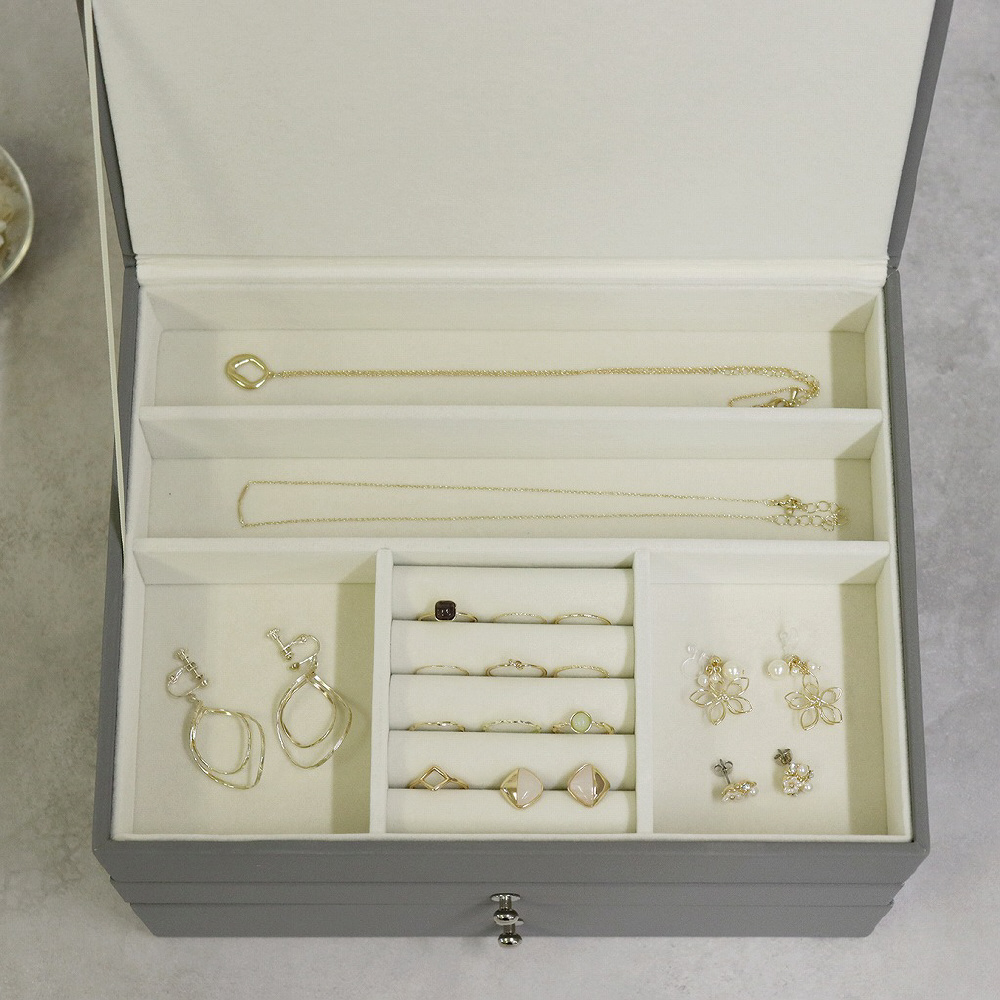 上段と2段目収納はさまざまな区分けがされており、リングやネックレスなどの収納に適しております。