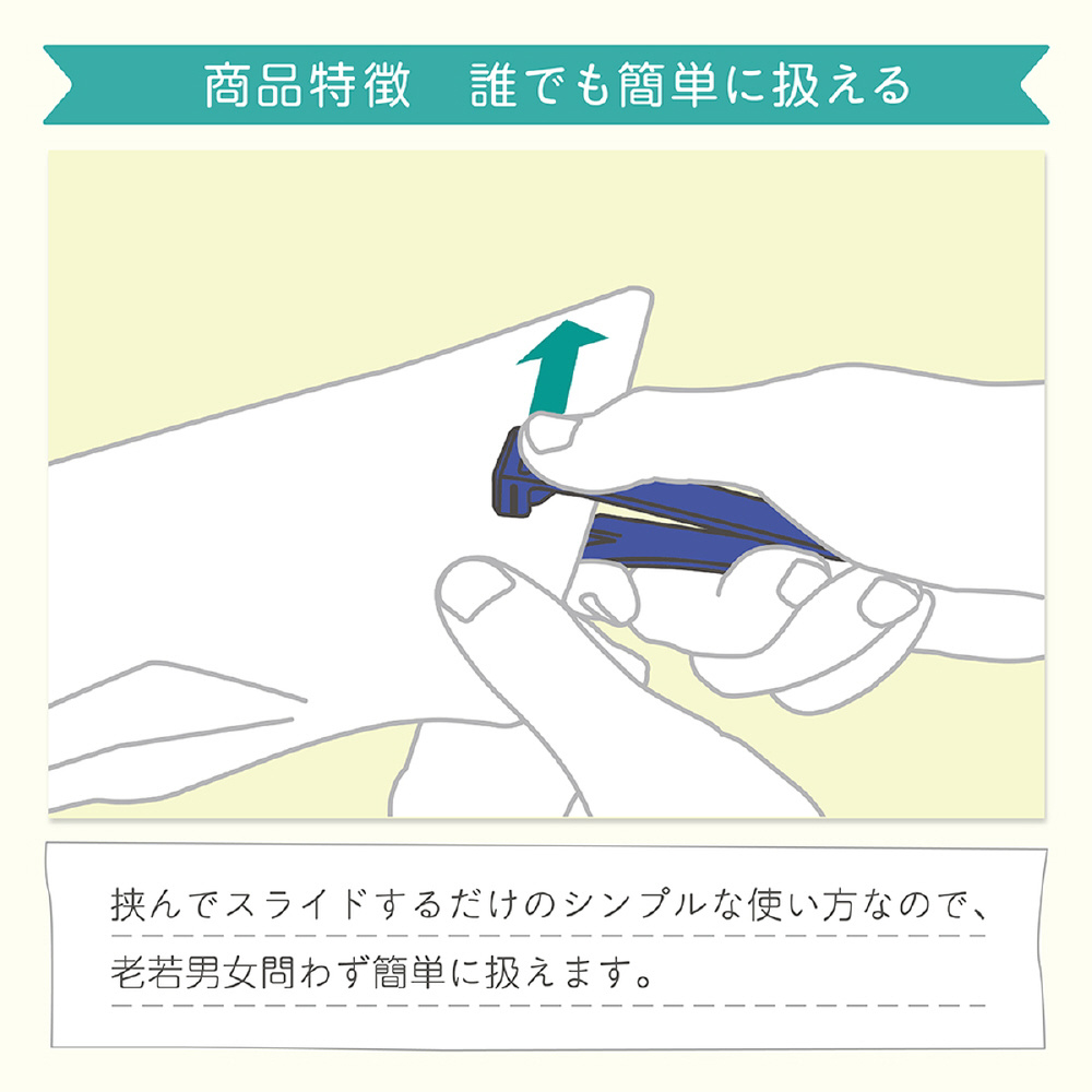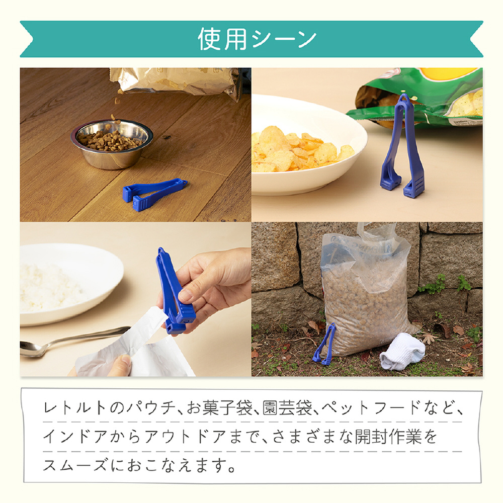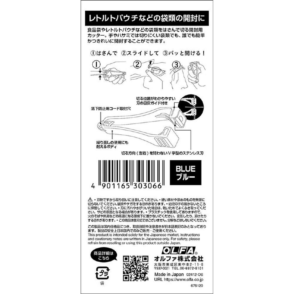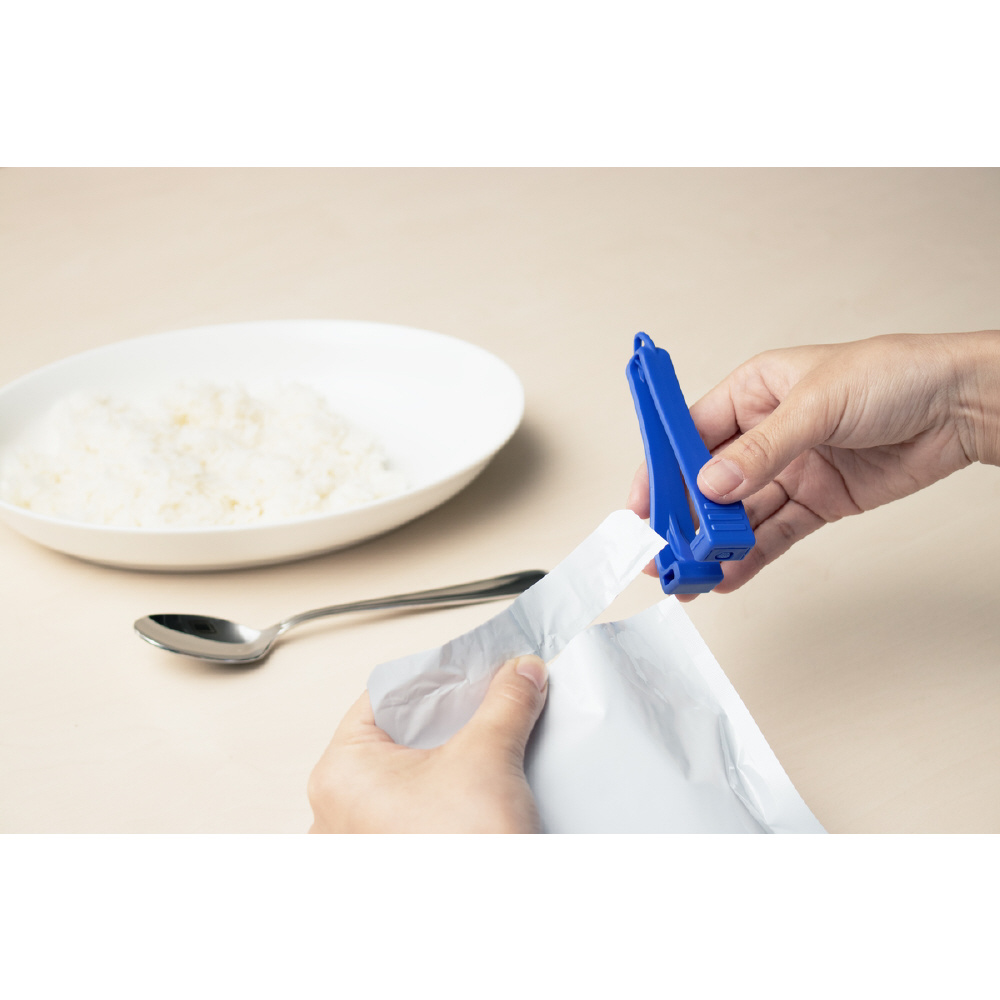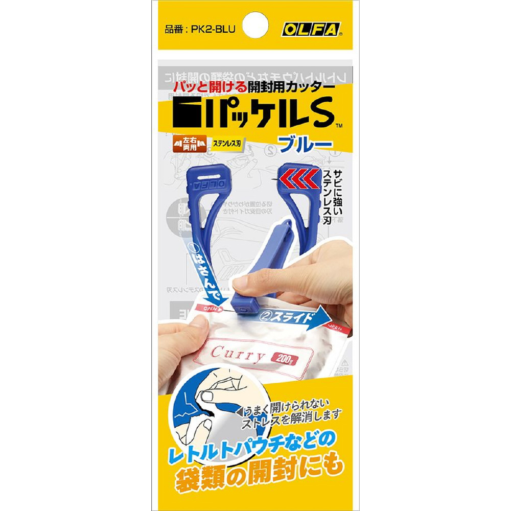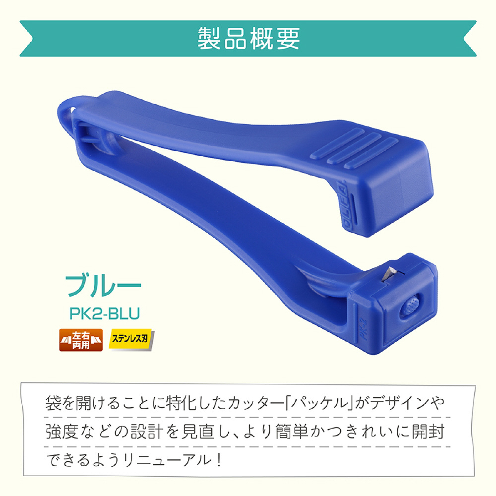 ●レトルトパウチや食品袋などの袋類を挟んで切る開封用カッターです。●左右両用で誰でも簡単に扱うことができます。●袋の途中から開封するため異物混入が軽減されます。●商品サイズ(約):42.8×101.9×21mm●商品重量(約):17g●パッケージサイズ(約):63×155×21mm●パッケージ重量(約):18g●材質:刃/ステンレス●カラー:ブルー●刃物ですので取り扱いに注意してください。●硬い素材や厚めのものを無理に切らないでください。●幼児の手の届かないところに保管してください。●刃に汚れや水がついた場合は、乾いた布でよくふき取ってください。●火のそばや熱湯などの高温になる環境下に置かないでください。●この商品は替刃式ではございません。分解などはしないでください。