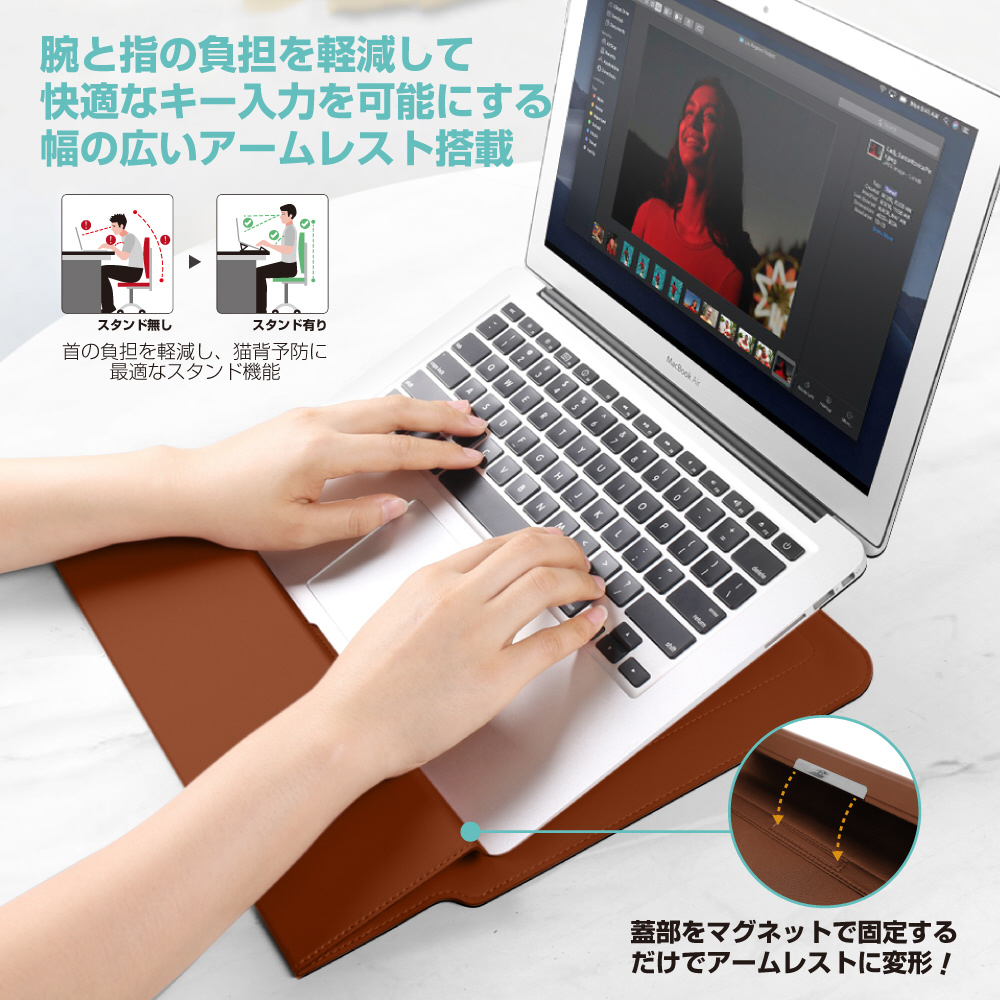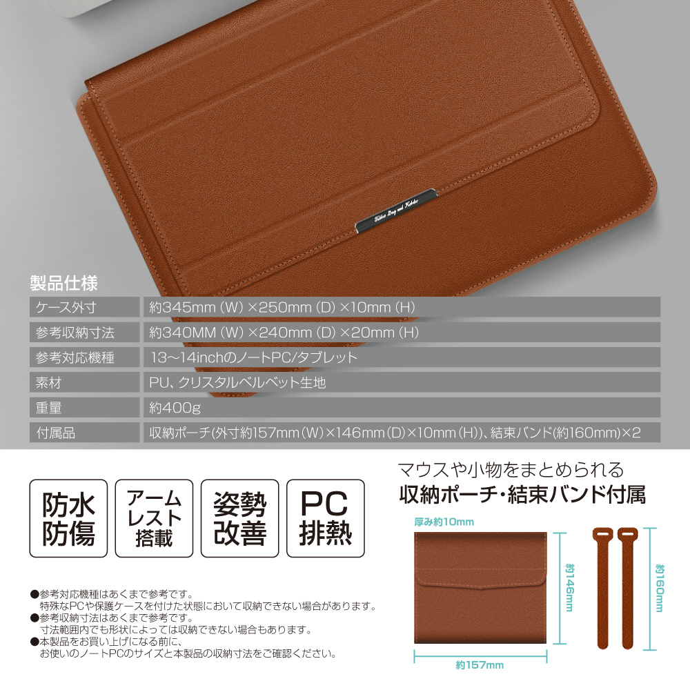 ノートパソコンやタブレットを収納できる、薄型スリーブケース。折りたためばスタンドにもなり、アームレスト付きで手首や腕の疲れを軽減。携帯に便利な小物収納ポーチと結束バンド付属。