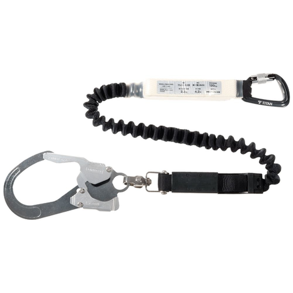 伸縮ストラップ式でコンパクトなシングルランヤード。新規格品で、使用可能質量は130kgです。