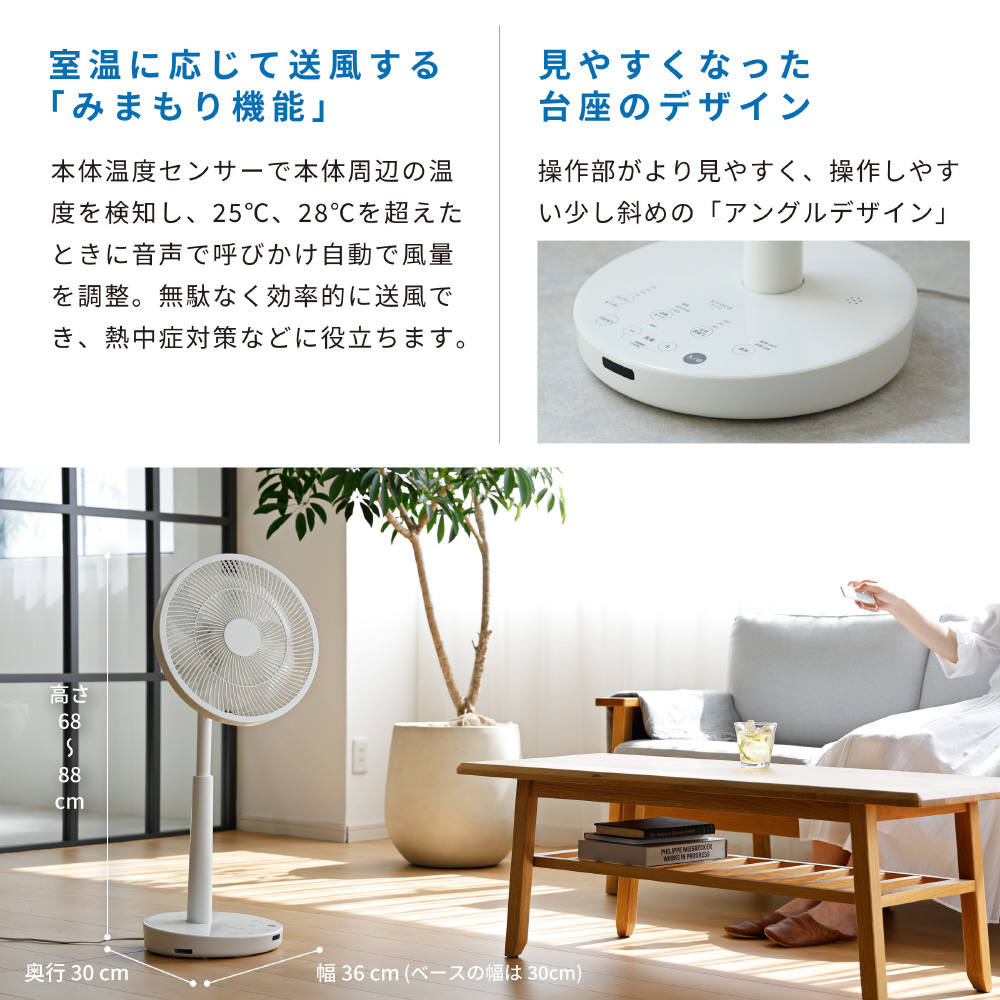 ・室温に応じて送風する「みまもりモード」本体に搭載された温度センサーで本体周辺の温度を検知し、自動的に室温に応じた風量に切り替えて運転。無駄なく効率的に送風でき、熱中症対策の一助に