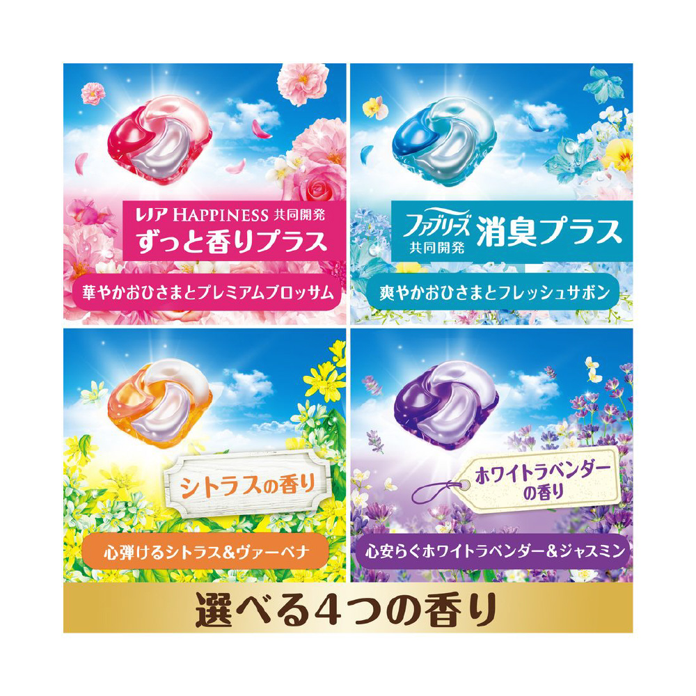 柔軟剤効果 4 in 1強洗浄 洗い上がり輝く白さシワ*1 &黄ばみ防止*1 アイロンがけが楽に!*1ふんわり仕上げ 驚きの柔らかさ香り長続き 着ている間も華やか消臭成分2倍濃縮*2縦型・ドラム式・すすぎ1回OK*1 弊社他洗剤比、平均洗濯物量(P&G調べ)比 *2 当社液体洗剤比 洗濯洗剤