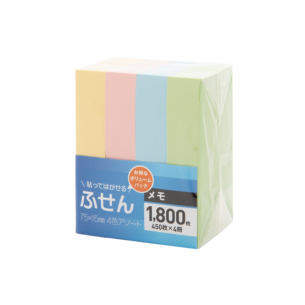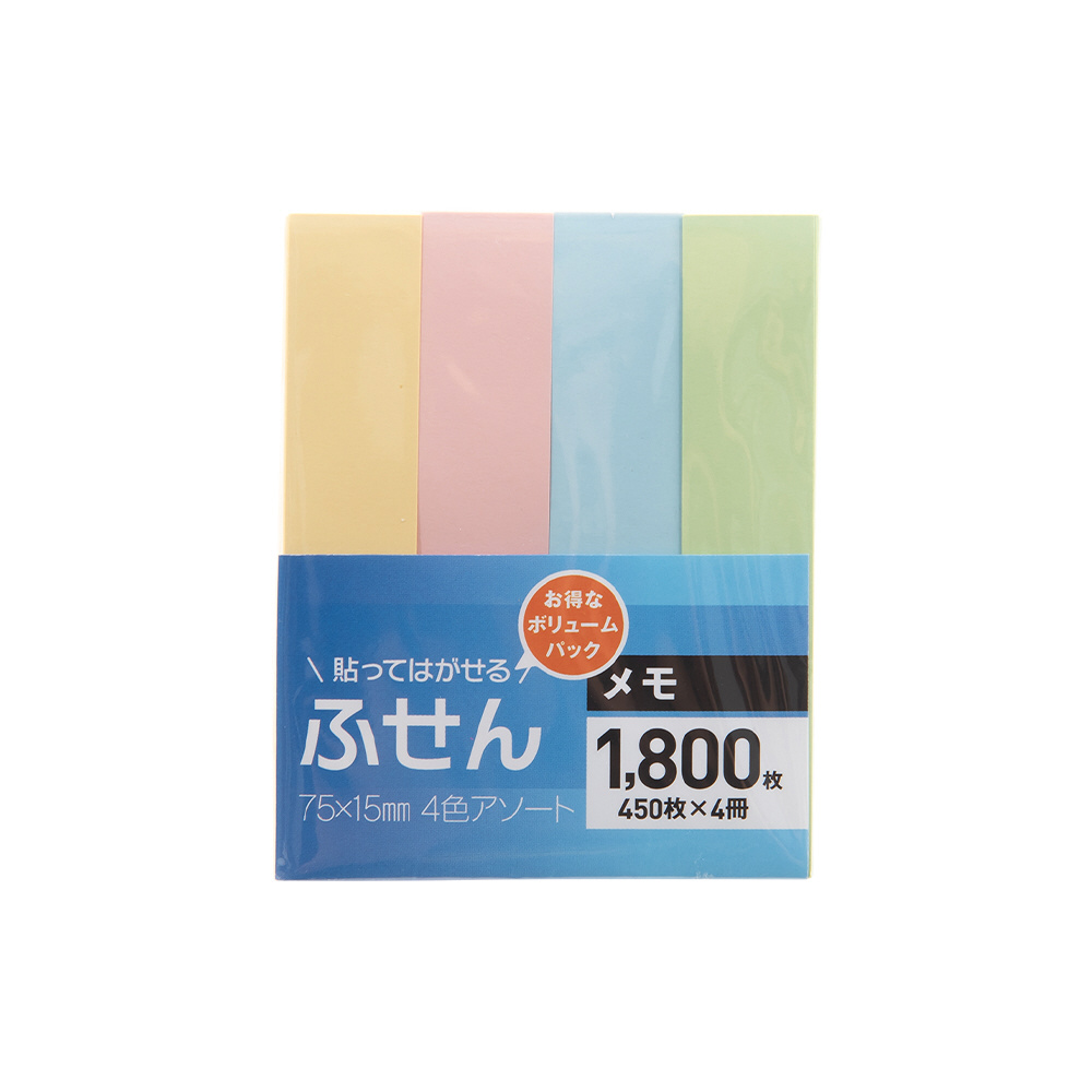 細かい箇所に貼りやすい75×15サイズ。4色アソートで色分け作業などに最適です。<BR>(半角)ブルー・グリーン・ピンク・イエロー 450枚×4冊<BR>(半角)ふせんサイズ:縦75x横15mm<BR>(半角)材質:紙