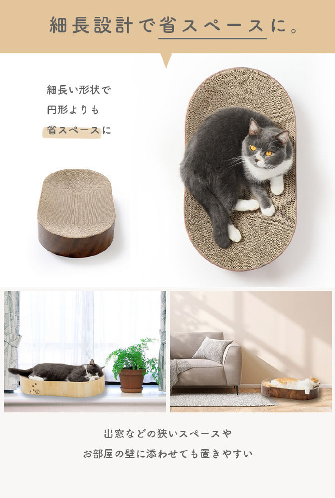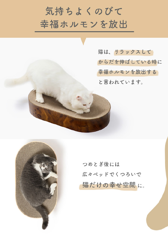 幅60cmののびのび設計なので、猫がつめとぎの上で、両手両足をついてしっかりとからだを伸ばして、つめとぎを楽しむことができます。猫はリラックスしてからだを伸ばしている時に、幸福ホルモンを放出すると言われています。つめとぎ後には、広々ベッドでくつろいで、猫だけの幸せ空間に。