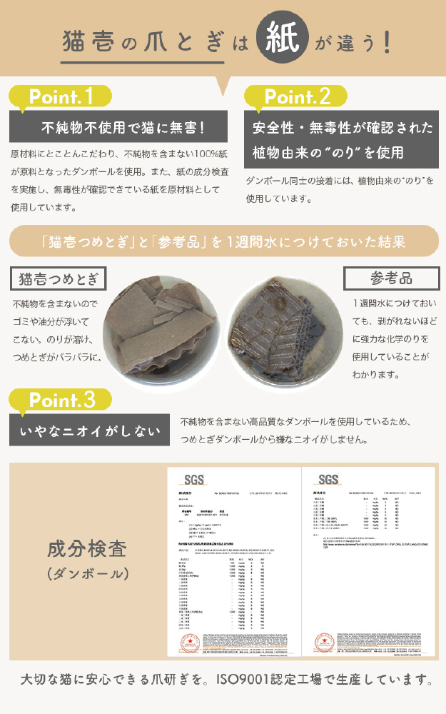 大切な猫たちが使う、猫にとって大切なつめとぎだから。品質にはとことんこだわり、ISO9001認定工場で生産しています。