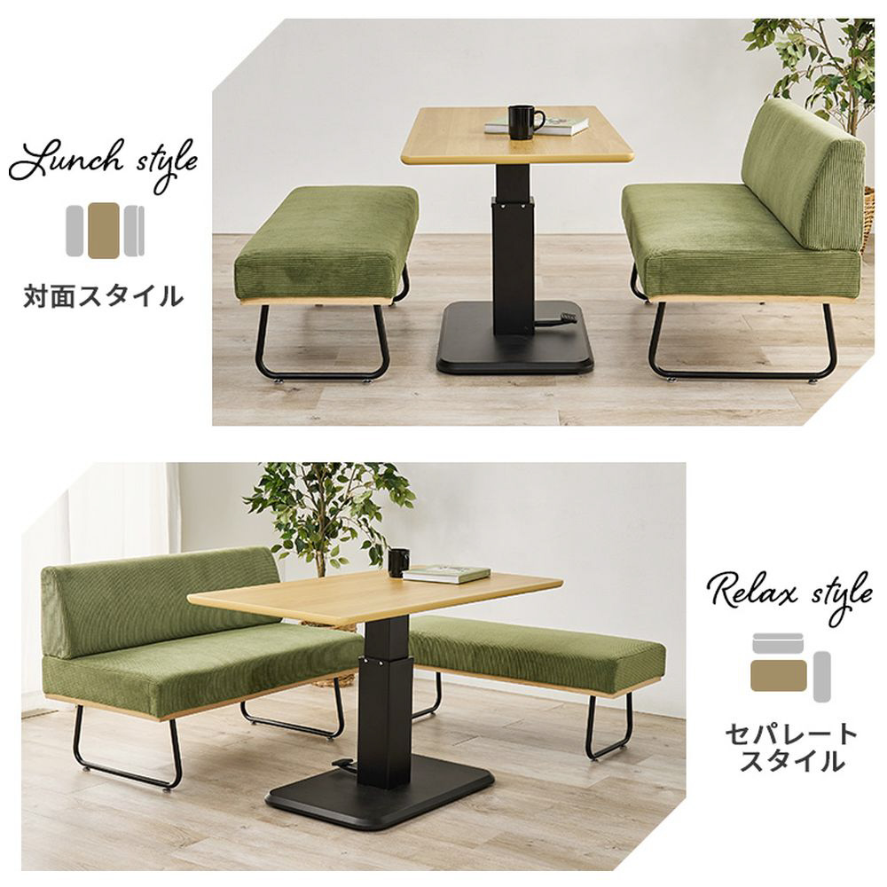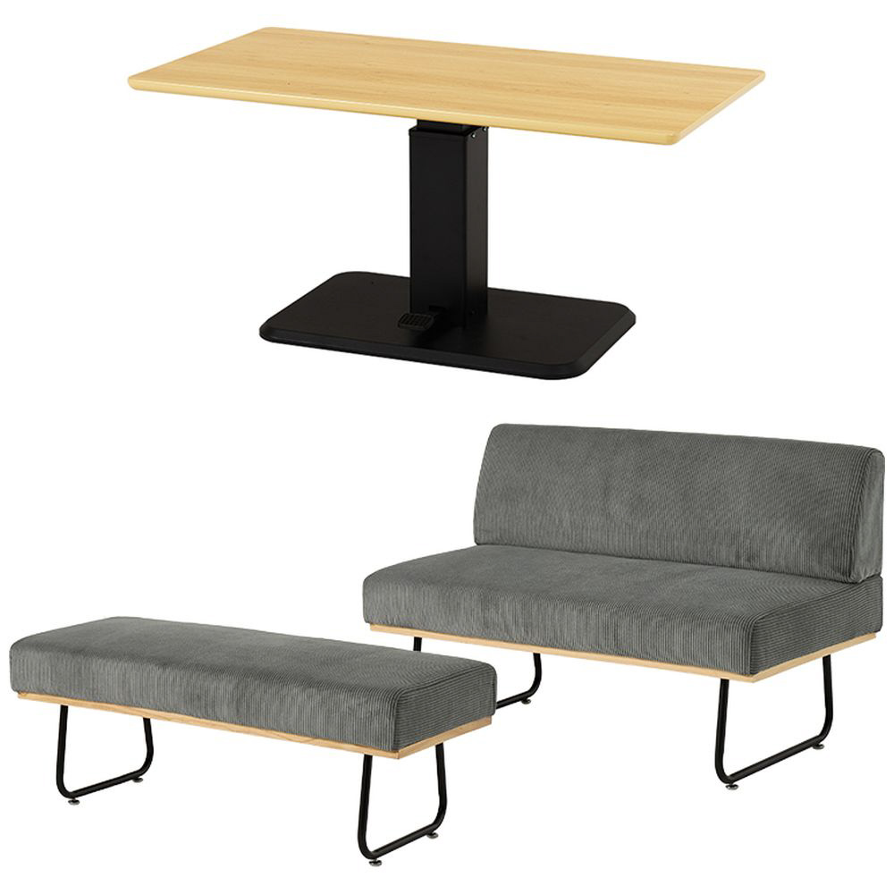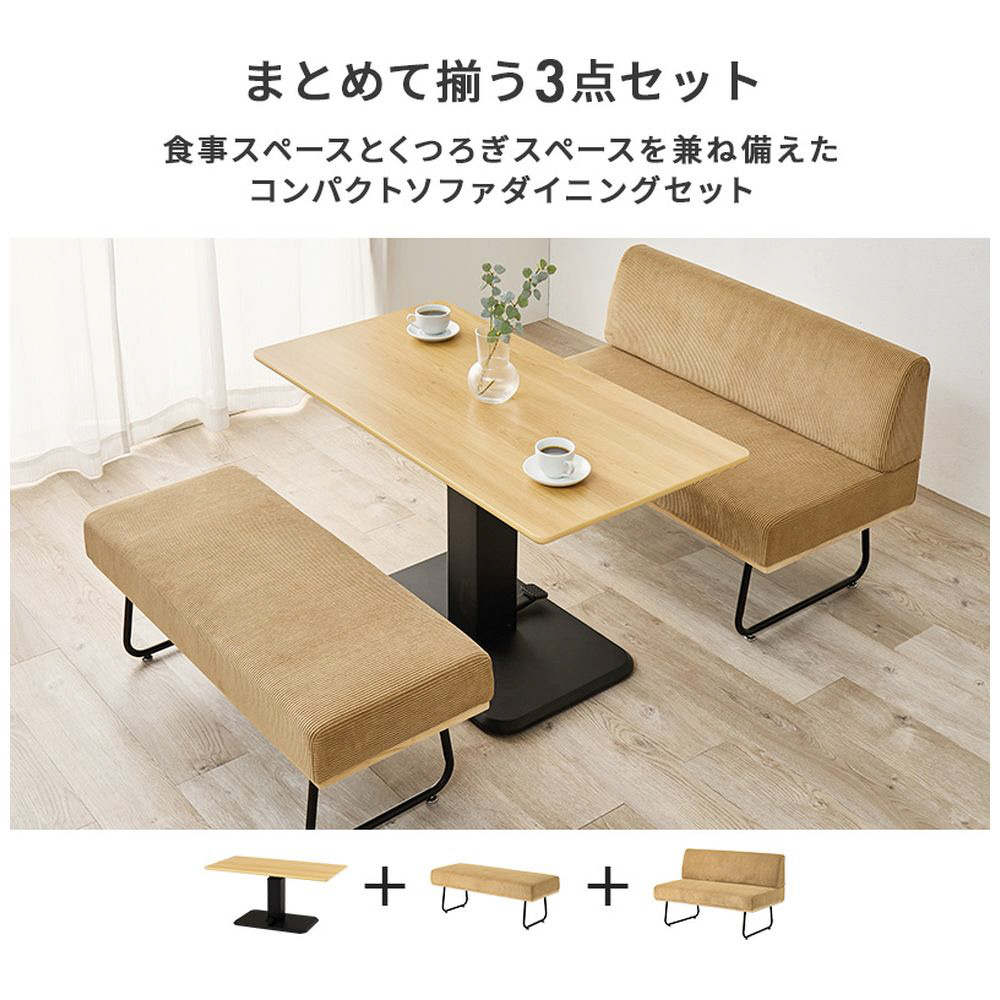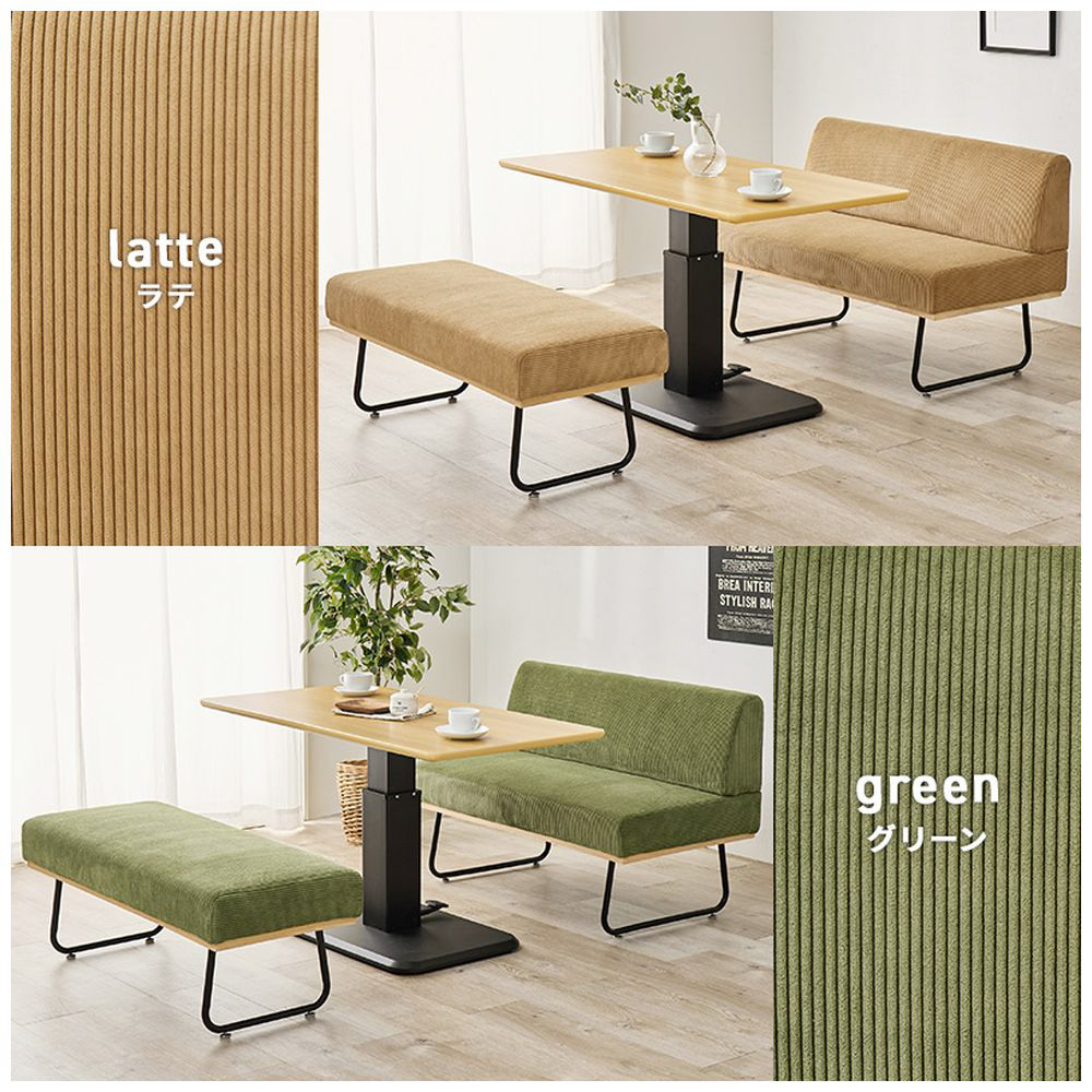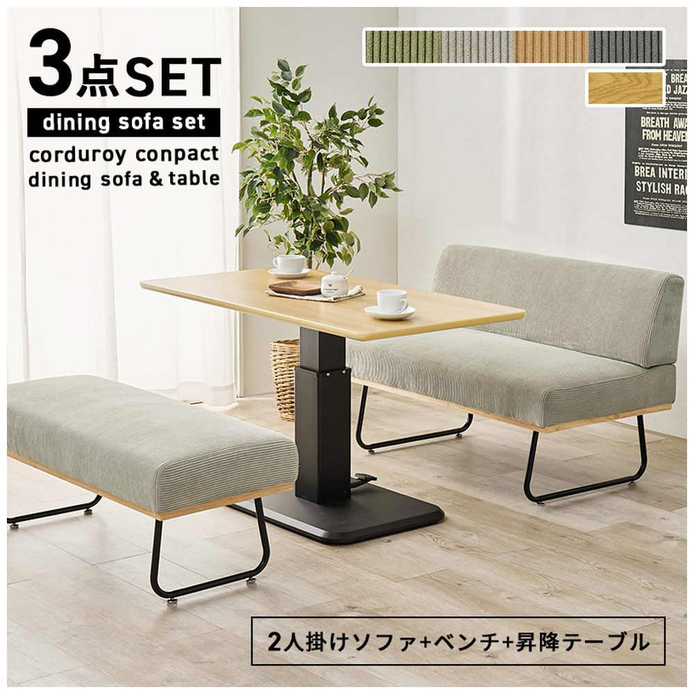 コーデュロイ生地のおしゃれなソファを合わせたダイニングセット。座面はやや低めで圧迫感を与えづらく、テーブルの天板は体格に合わせて無段階に昇降できます。