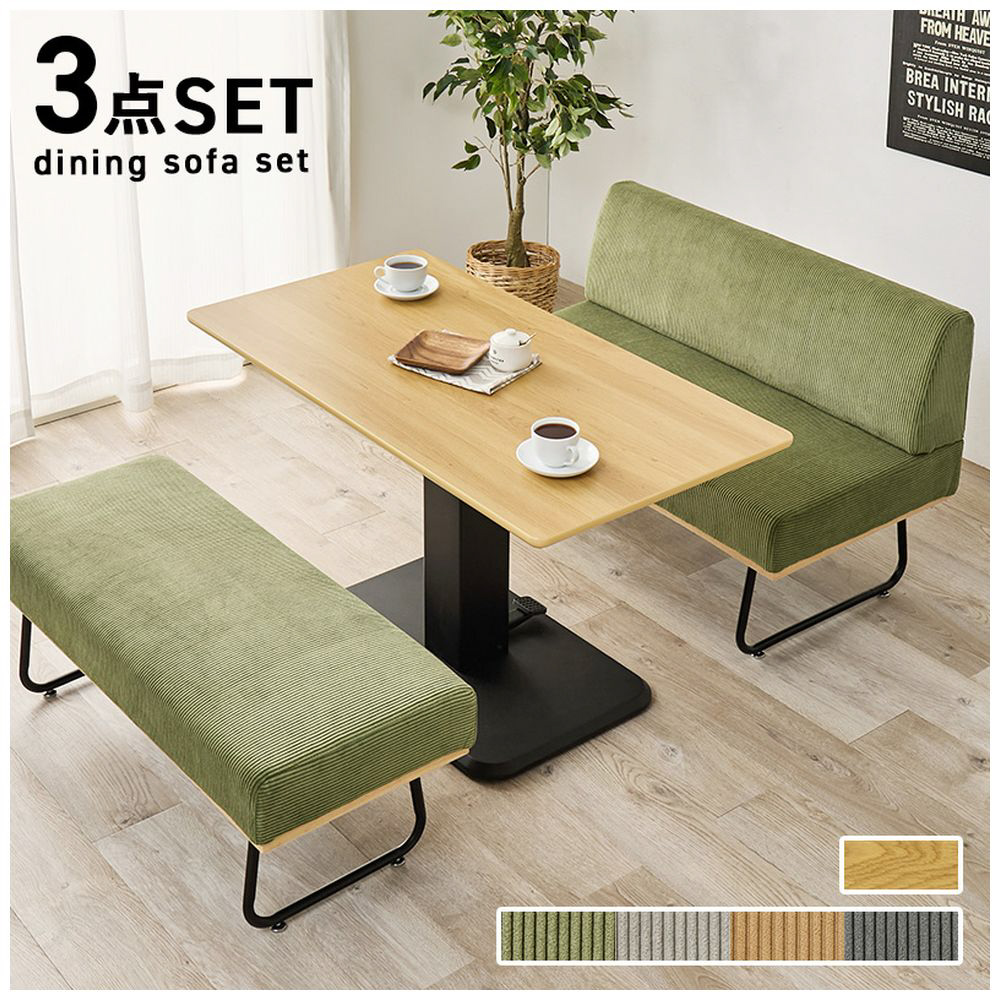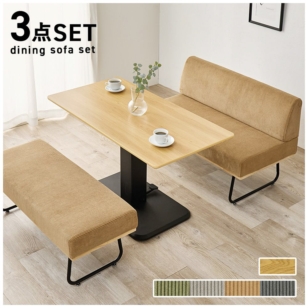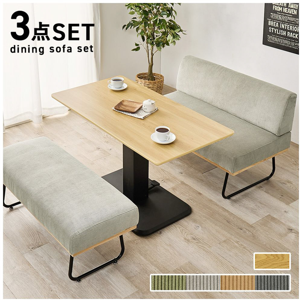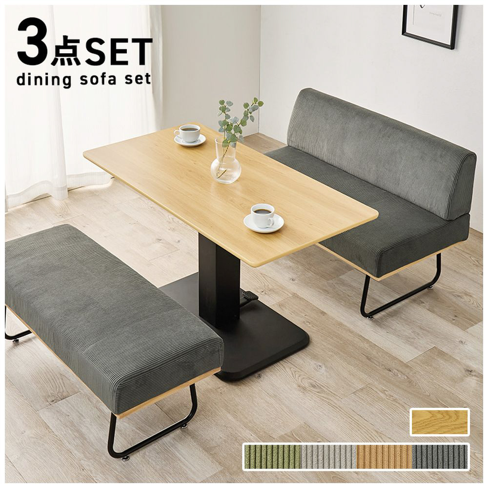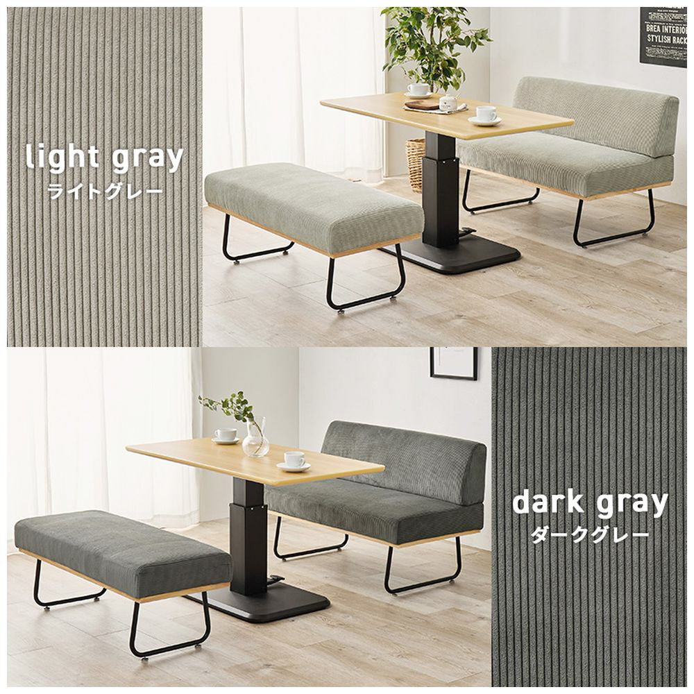 コーデュロイ生地のおしゃれなソファを合わせたダイニングセット。座面はやや低めで圧迫感を与えづらく、テーブルの天板は体格に合わせて無段階に昇降できます。