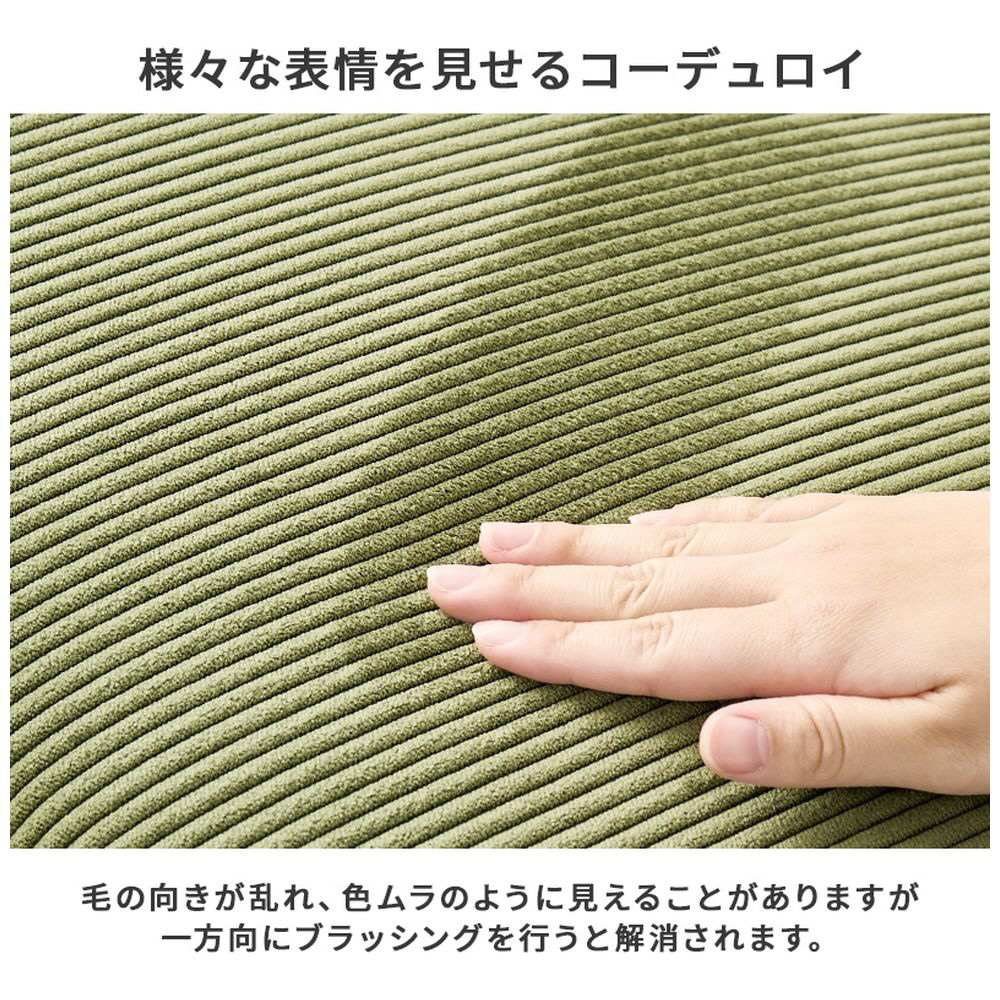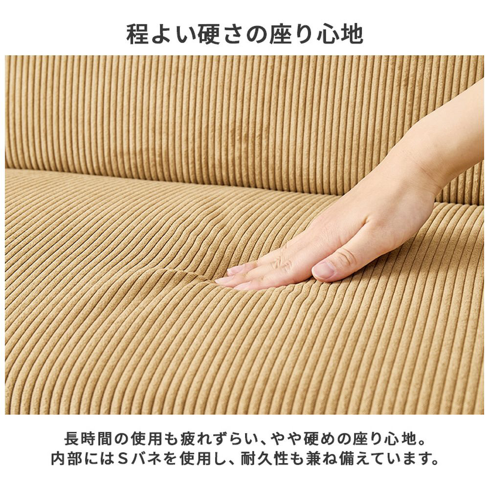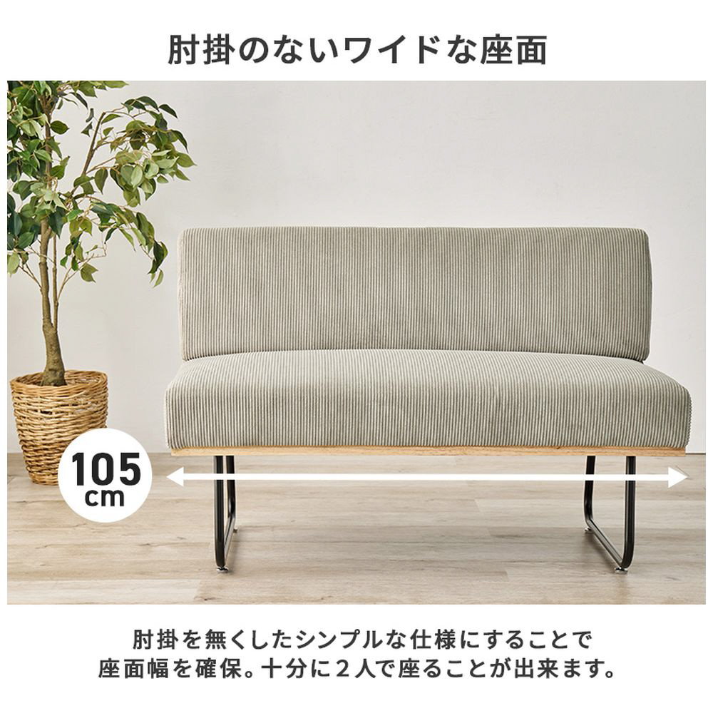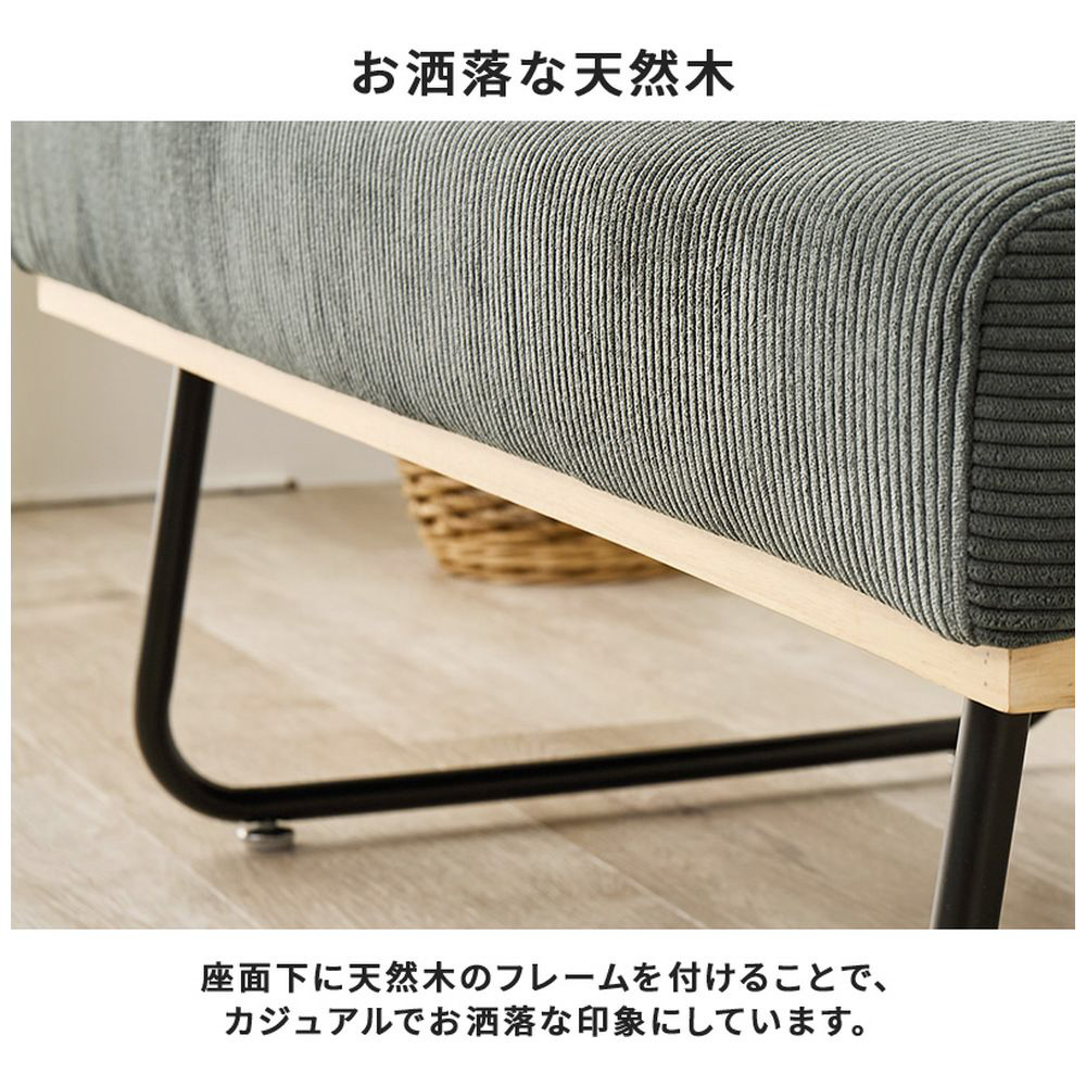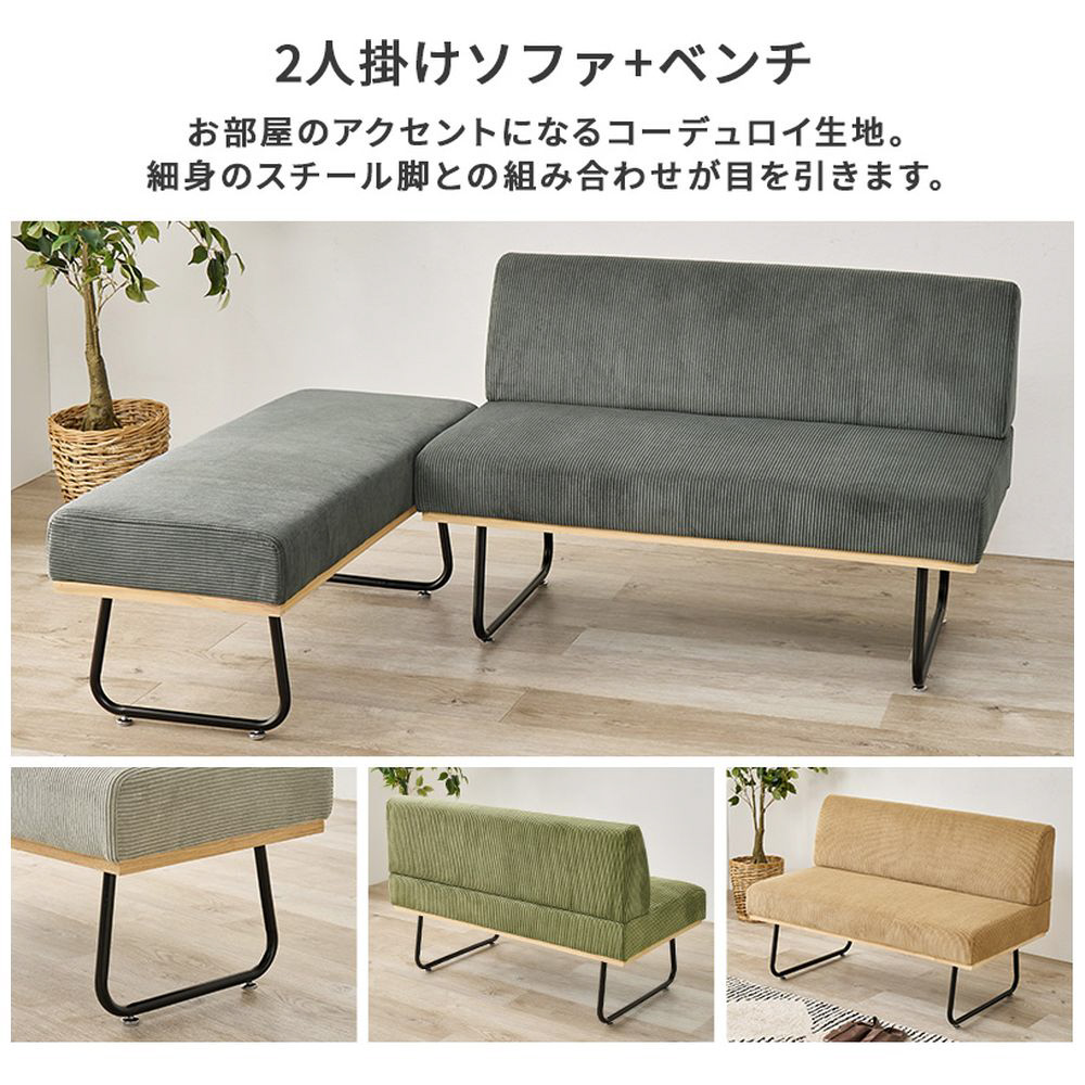 コーデュロイ生地のおしゃれなソファを合わせたダイニングセット。座面はやや低めで圧迫感を与えづらく、テーブルの天板は体格に合わせて無段階に昇降できます。