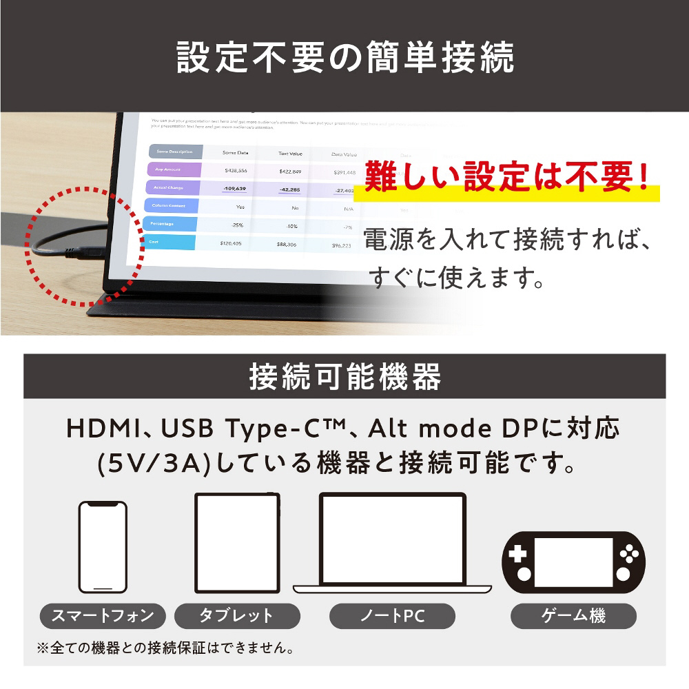 ■映像出力機器によっては、Type-Cケーブル1本だけで本製品に映像入力と給電をまとめて行えます。