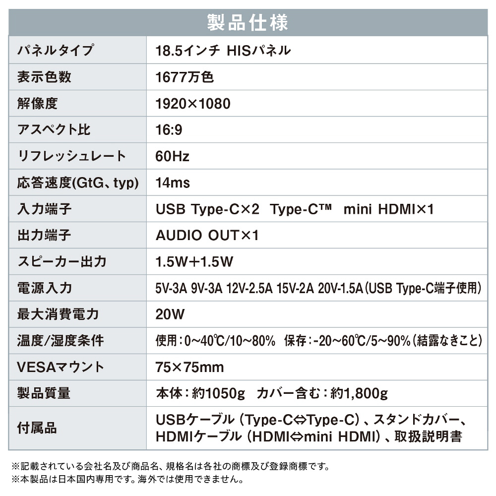 付属品 USBケーブル(Type-C⇔Type-C)、HDMIケーブル(HDMI⇔mini HDMI)、スタンドカバー、取扱説明書