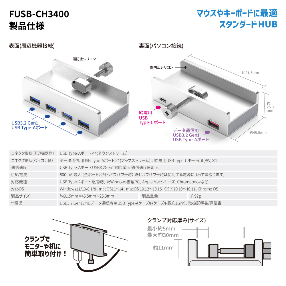 FUSB-CH3400 USB-A → USB-C+USB-A 変換ハブ クランプ固定式(Chrome/Mac/Windows11対応) シルバー [バス&セルフパワー /5ポート /USB 3.2 Gen1対応]