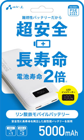 リン酸鉄モバイルバッテリー 5000mAh 超安全 + 長寿命 電池寿命 2倍 安全性と長寿命を両立した高性能バッテリーを採用 充放電 1000回 可能