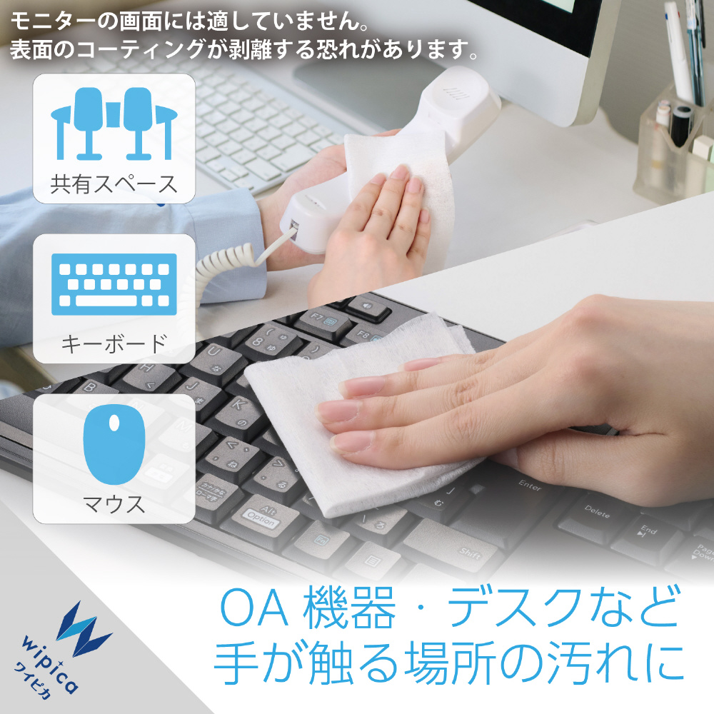 キーボード、マウス、受話器、その他OA機器、共有スペースなどの汚れ取り、除菌にご使用できます。
