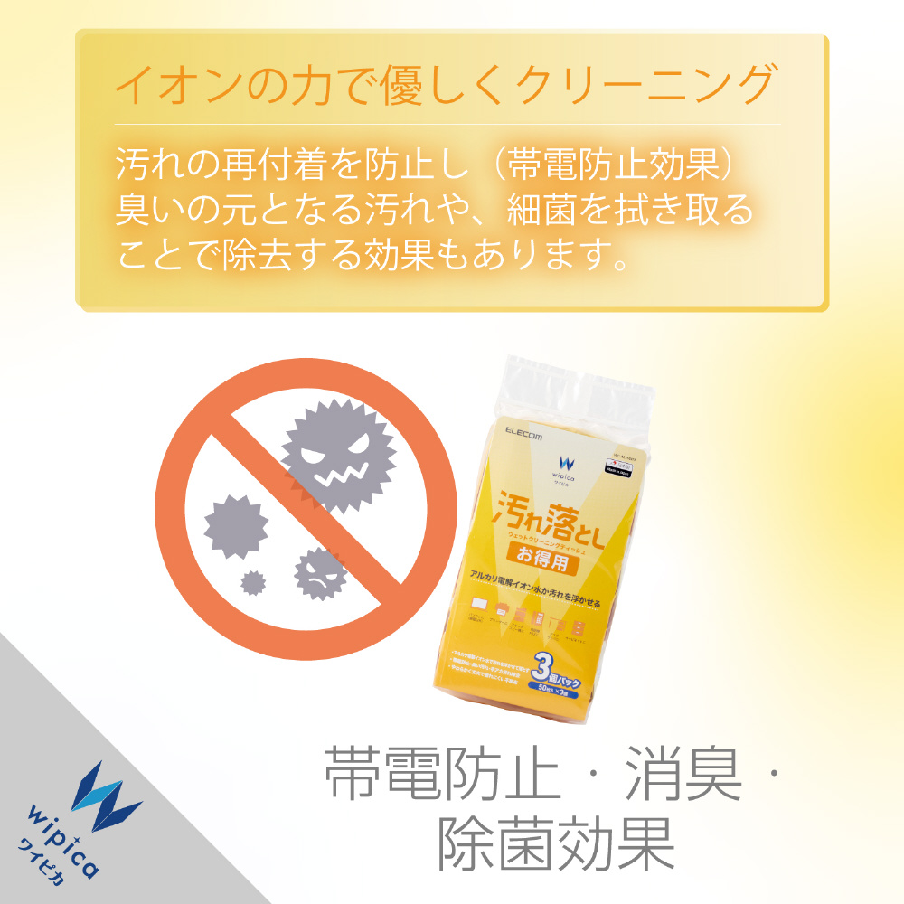 アルカリ電解イオン水が汚れを浮かせて落とす、日々のお掃除に最適なお求めやすい価格のお得用ウェットクリーニングティッシュです。