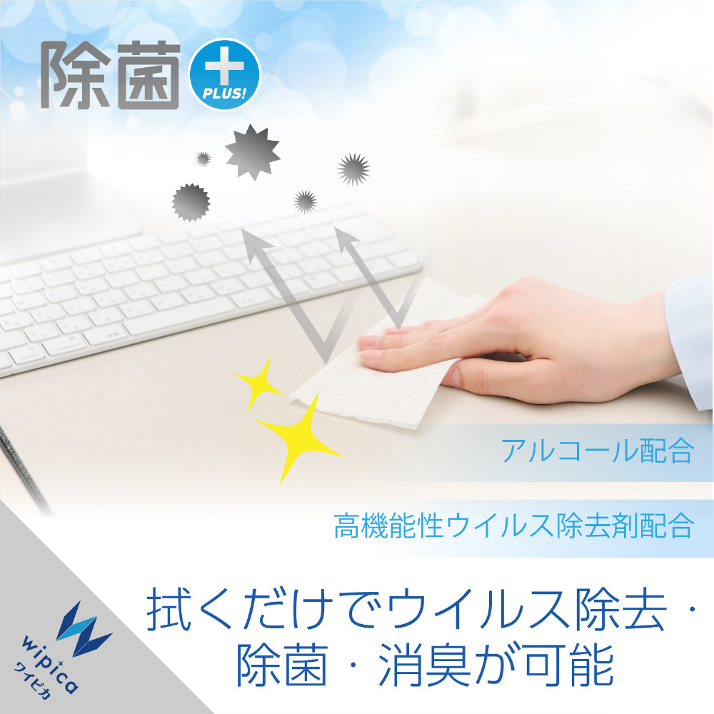 アルコールと高機能性ウイルス除去剤を配合し、拭くだけでウイルス除去・除菌・消臭が可能なウェットクリーニングティッシュです。