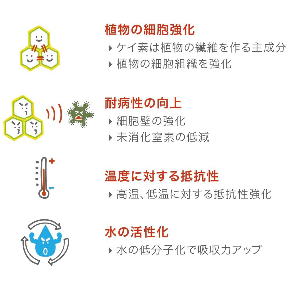水溶性ケイ素配合で植物の生育をサポート。根や茎を丈夫にし、健康的な成長を促します。微細な粒子で葉への吸収も効率的です。